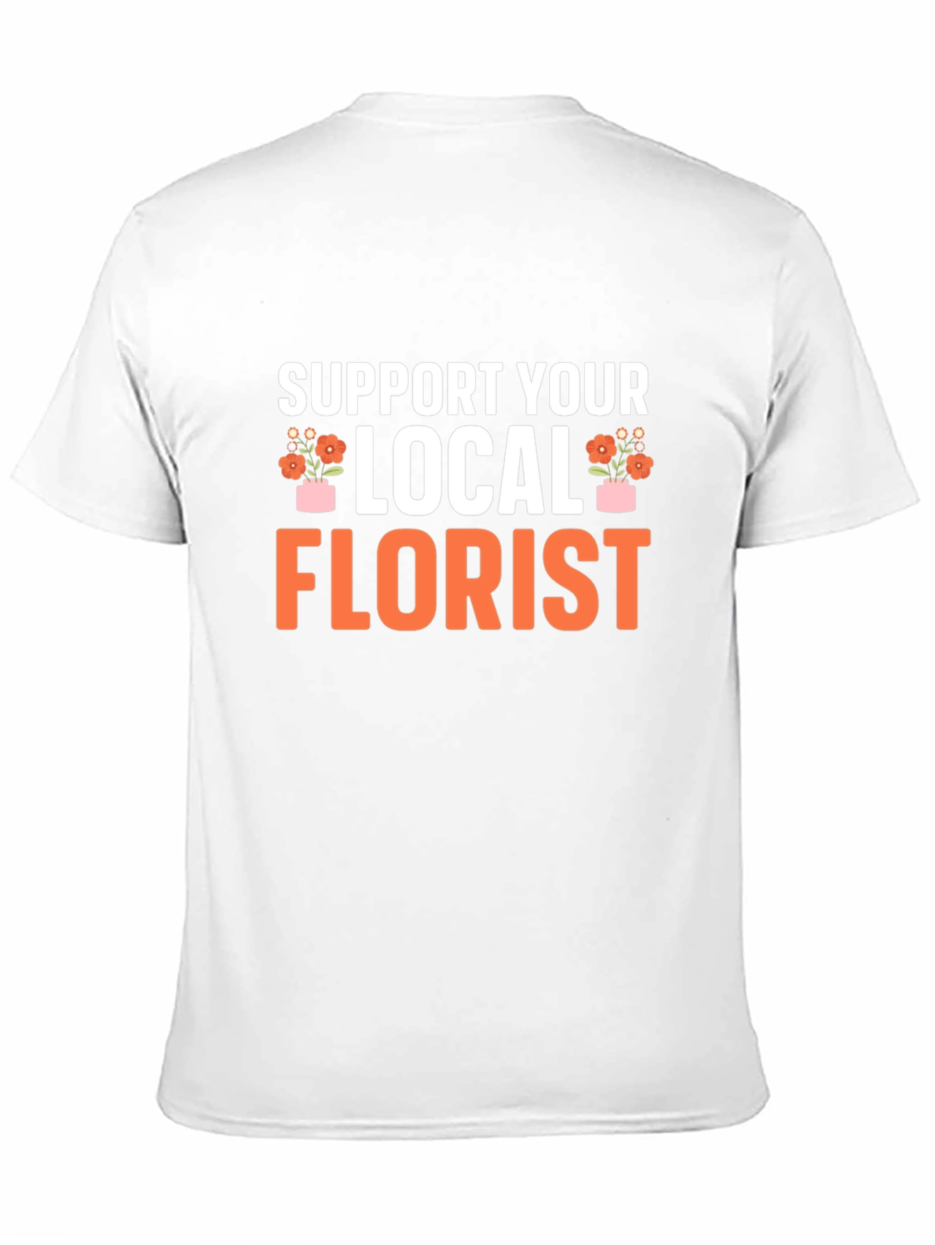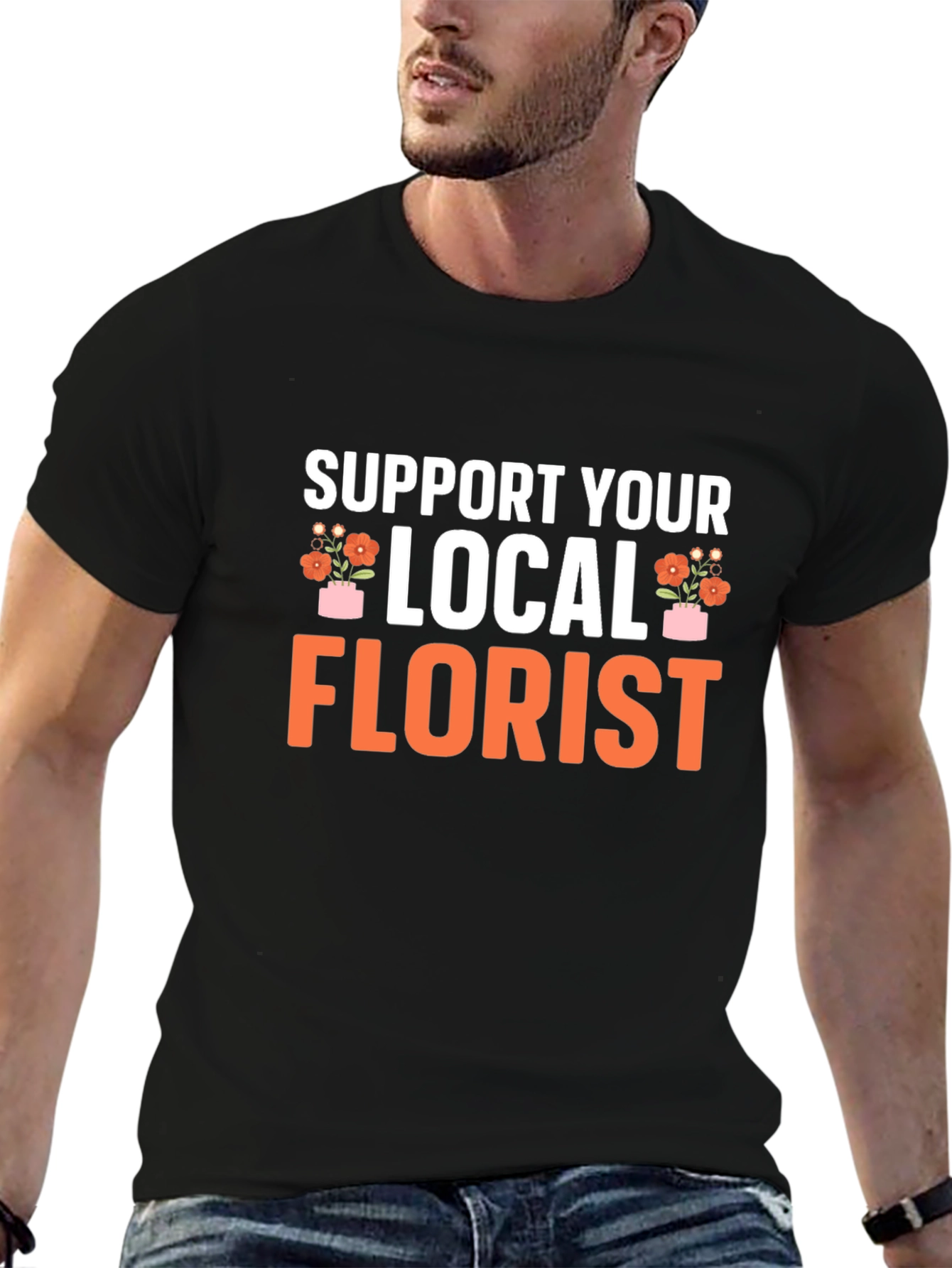 Show your love for local businesses with this stylish black t-shirt. Featuring the phrase "Support Your Local Florist" in bold, eye-catching white and orange lettering, this shirt is perfect for flower enthusiasts and small business supporters alike. Two cute flower graphics flank the word "Local," adding a touch of charm to the design. Made from comfortable, breathable fabric, this tee is ideal for everyday wear. Whether you're running errands, volunteering at a community garden, or simply spreading positivity, this shirt is a great way to make a statement. Get yours today and support local!