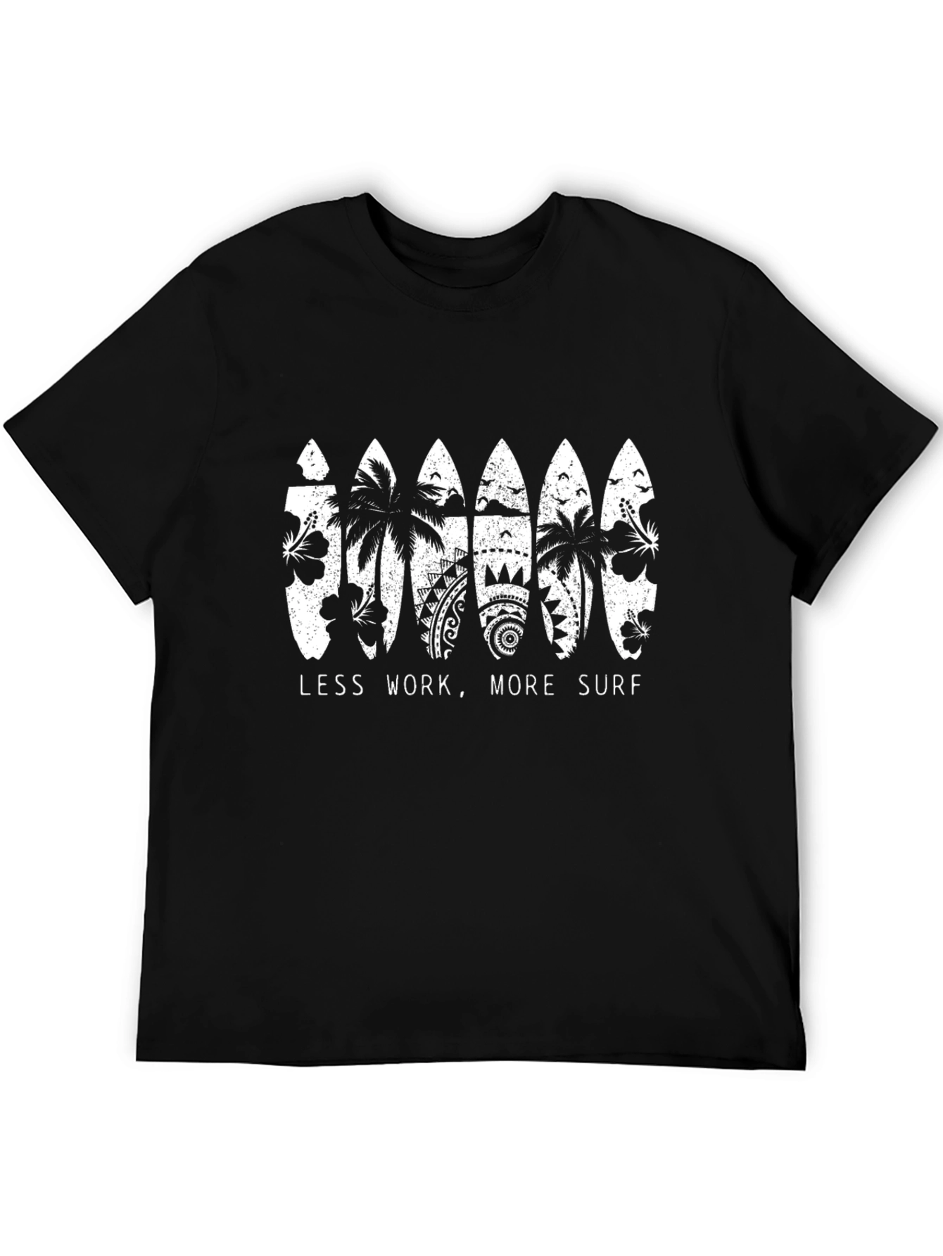 This stylish men's black t-shirt features a unique graphic print of surfboards with tropical patterns. The design includes silhouettes of palm trees, tribal motifs, and floral accents, adding a cool and laid-back vibe. The shirt also features the text "LESS WORK, MORE SURF". Made from comfortable, breathable fabric, it's perfect for casual wear, beach outings, or summer adventures. Show off your love for surfing and the beach with this eye-catching tee, ideal for making a statement wherever you go. A must-have for surf enthusiasts and anyone who loves unique, graphic apparel.