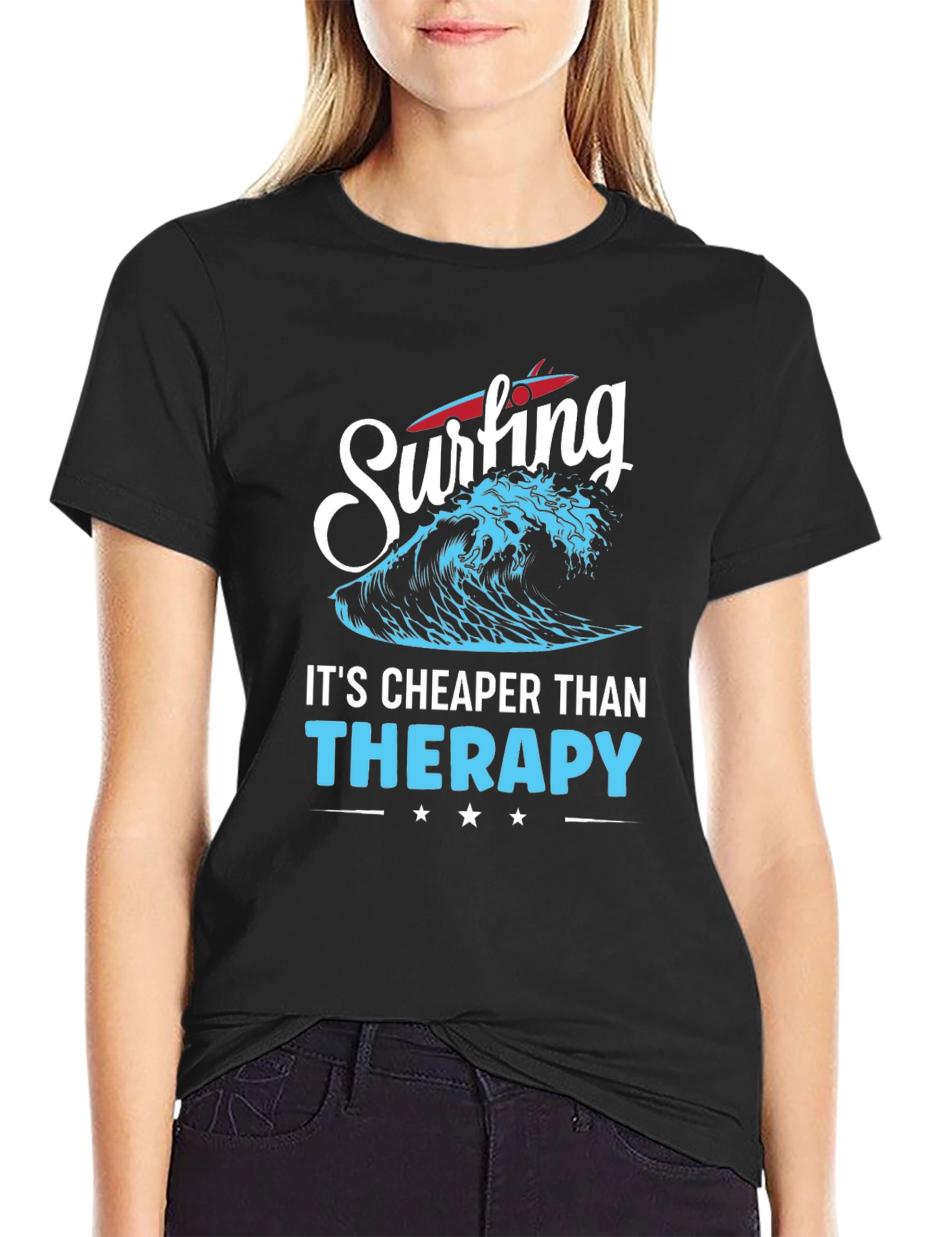 Ride the wave in style with this unique graphic tee. Made from comfortable fabric, this black t-shirt features a vibrant design that incorporates a stylized wave and surfboard along with the playful slogan "Surfing it's cheaper than therapy". The bold text and eye-catching imagery make it a standout piece for casual wear. Ideal for surfers, beach lovers, or anyone who appreciates a touch of humor in their wardrobe, this tee is perfect for everyday wear, beach outings, or casual gatherings. Show off your love for the ocean and a good laugh with this must-have addition to your collection.