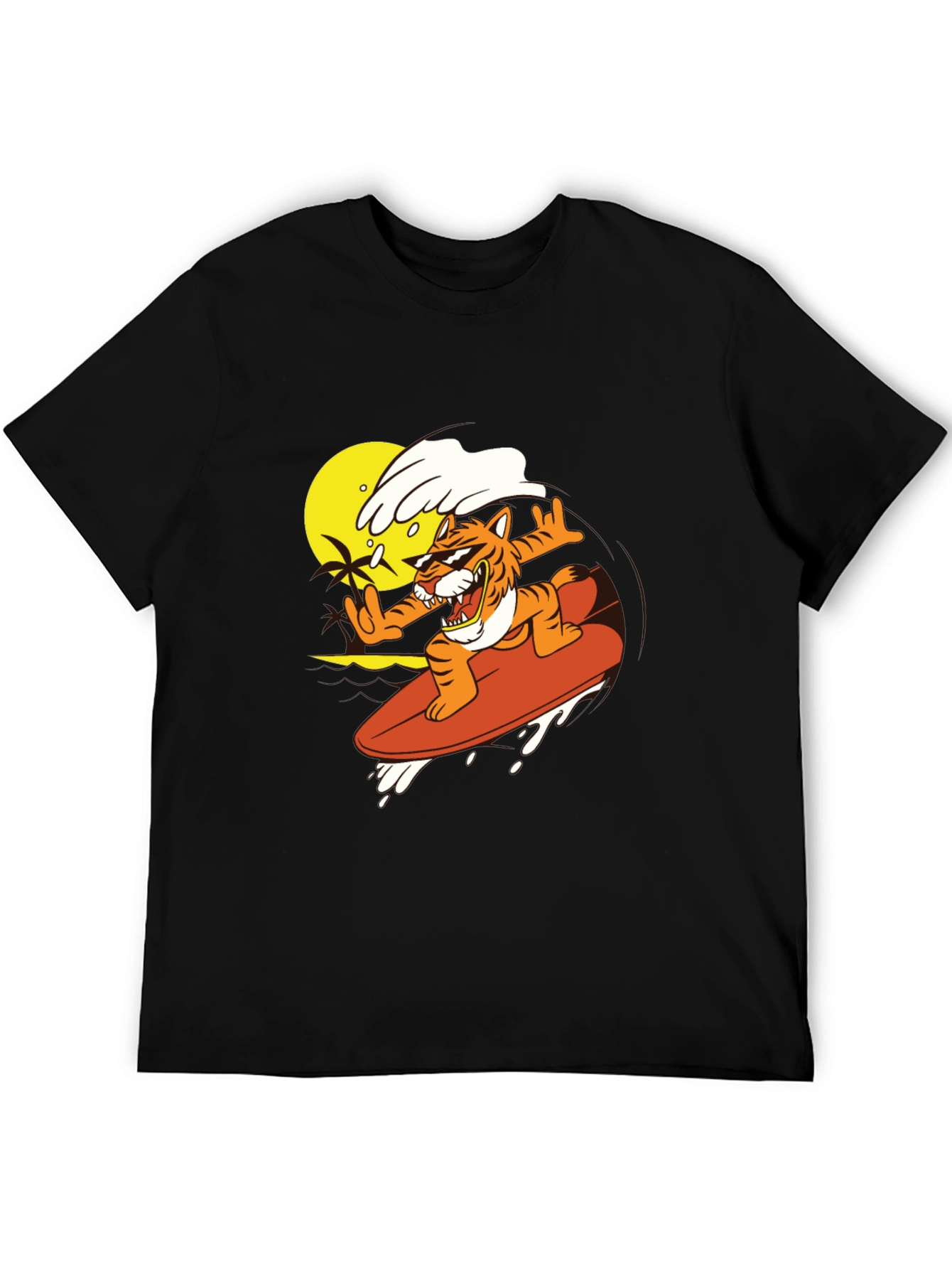 Catch some waves in style with this unique black t-shirt featuring a cartoon tiger surfing! The vibrant graphic design showcases a cool tiger riding a surfboard against a backdrop of a sunny beach scene. Made from comfortable, breathable fabric, this tee is perfect for casual wear, beach days, or as a fun statement piece. The eye-catching design is sure to turn heads and spark conversation. Great for those who love animals, surfing, or just want to add a playful touch to their wardrobe. Add this awesome tee to your collection today!