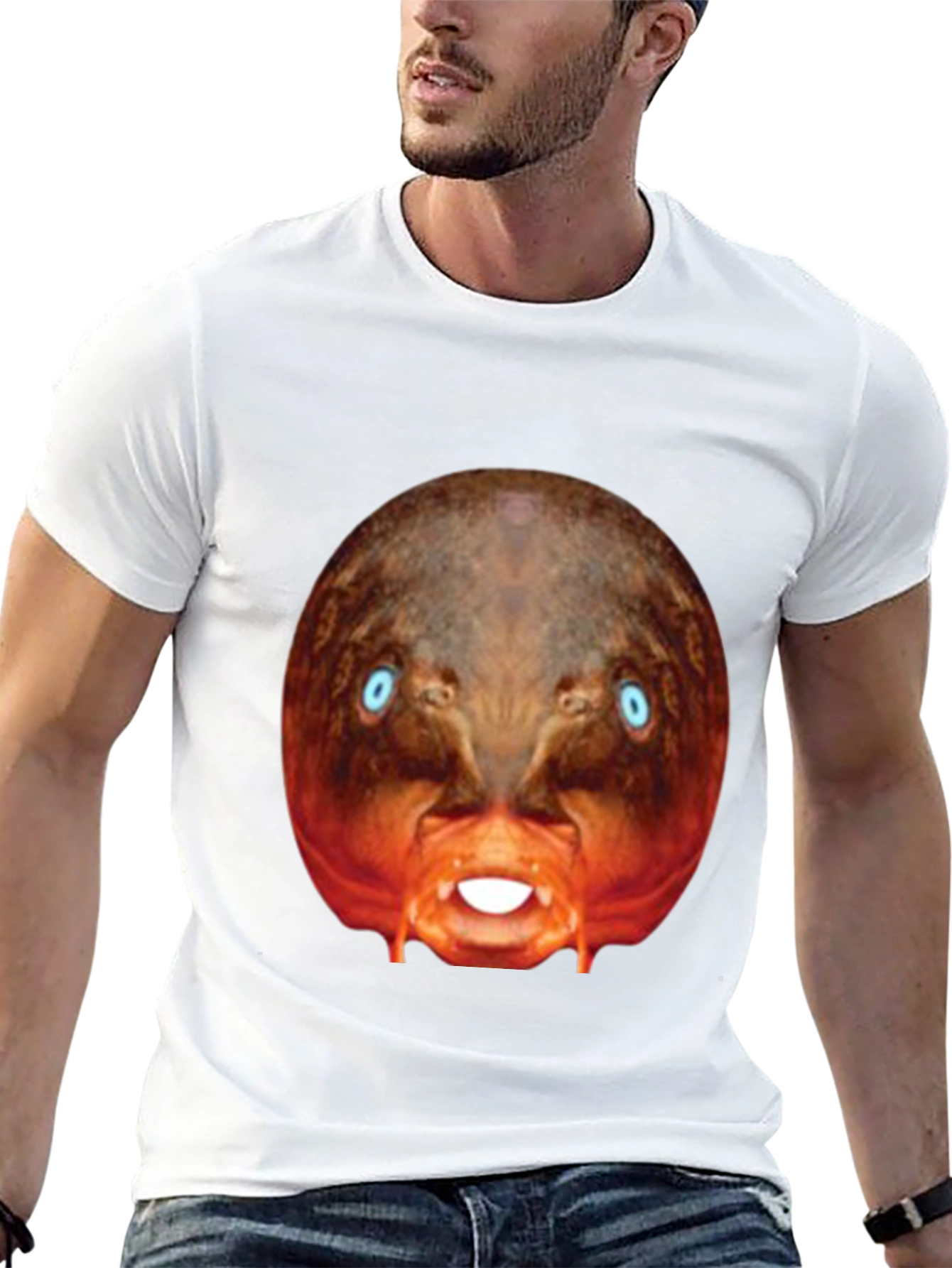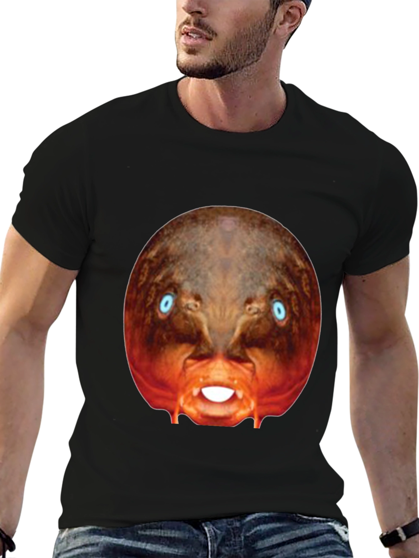 Make a bold statement with this eye-catching black t-shirt! This tee features a bizarre, digitally-rendered image of a creature with piercing blue eyes and exposed teeth, centered prominently on the chest. The surreal design stands out against the classic black backdrop. Made from what appears to be a soft, comfortable cotton blend, this shirt is perfect for casual wear, concerts, or adding a touch of the unexpected to your everyday style. Express your unique personality with this conversation-starting graphic tee. Perfect for those who appreciate distinctive designs and want to make a statement.