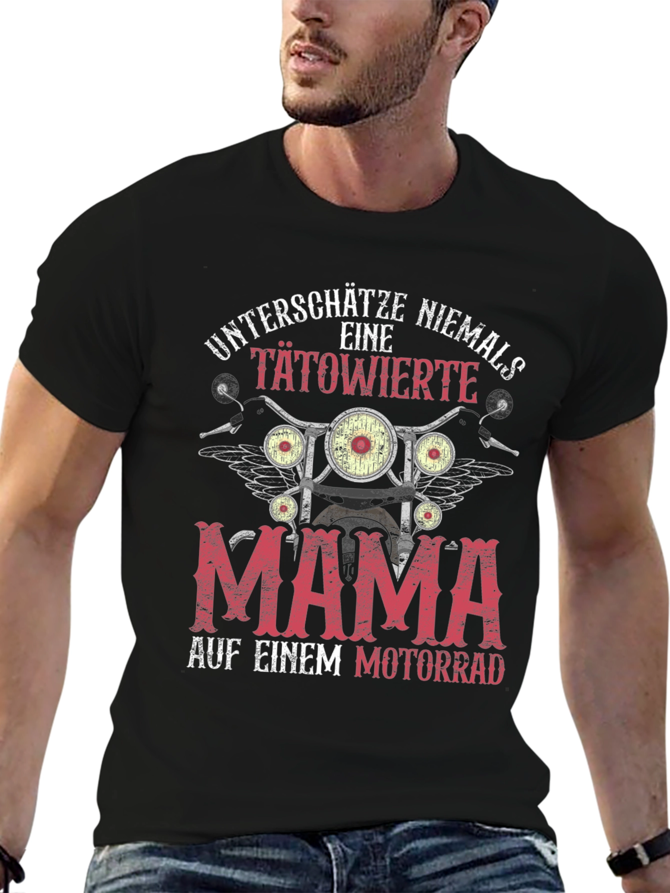 Show off your bold style with this black graphic t-shirt. The design features the saying "Unterschätze niemals eine Tättowierte Mama auf einem Motorrad", with an image of a motorcycle. The red and white text contrasts against the black tee for a statement look. Made from soft and breathable fabric, this t-shirt ensures all-day comfort. Perfect for casual outings, motorcycle rides, or as a gift for a cool mom.