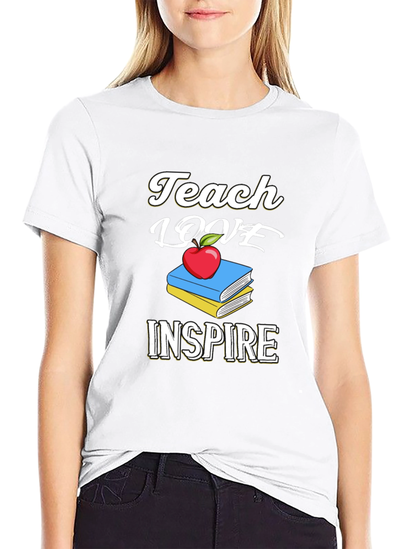 Show your appreciation for educators with this stylish 'Teach Love Inspire' T-shirt. Featuring a charming design with stacked books and a bright red apple, this tee is perfect for teachers who dedicate themselves to shaping young minds. The bold, eye-catching print stands out on the classic black fabric, making it suitable for everyday wear. Made from comfortable materials, this shirt is ideal for classroom activities, school events, or casual outings. Give the gift of style and inspiration to your favorite teacher!