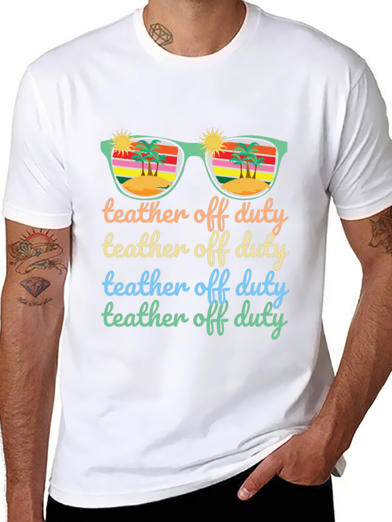 Embrace the summer break with this fun "Teacher Off Duty" black t-shirt! Featuring a vibrant design with sunglasses reflecting a tropical beach scene, this tee captures the essence of relaxation and vacation. The playful text is displayed in a colorful, stacked format, adding a unique touch. Made from a comfortable-looking fabric, this shirt is perfect for casual outings, beach trips, or just lounging around during the well-deserved break. Show off your teacher pride in style while enjoying your time off! Get ready to relax and soak up the sun with this must-have summer tee.