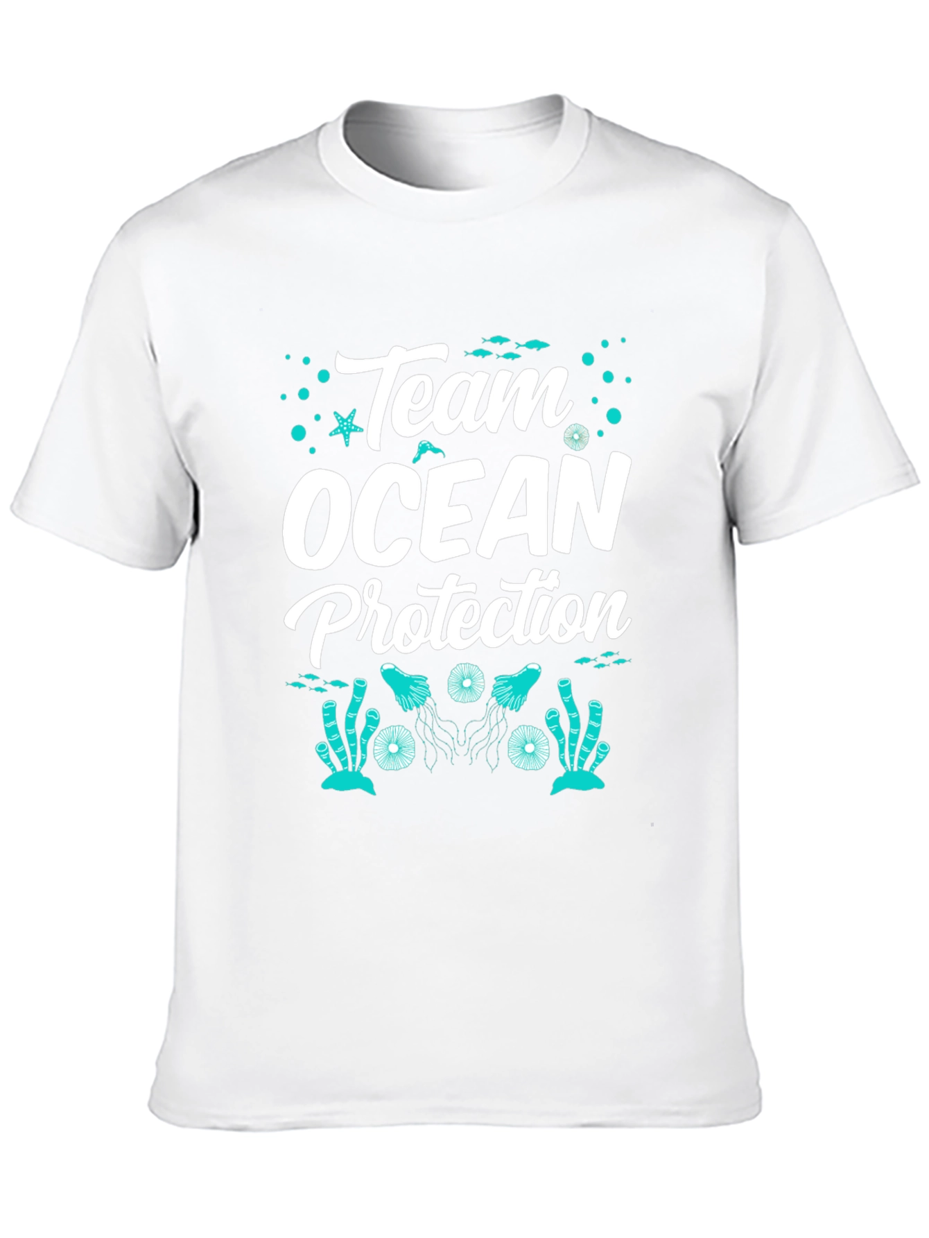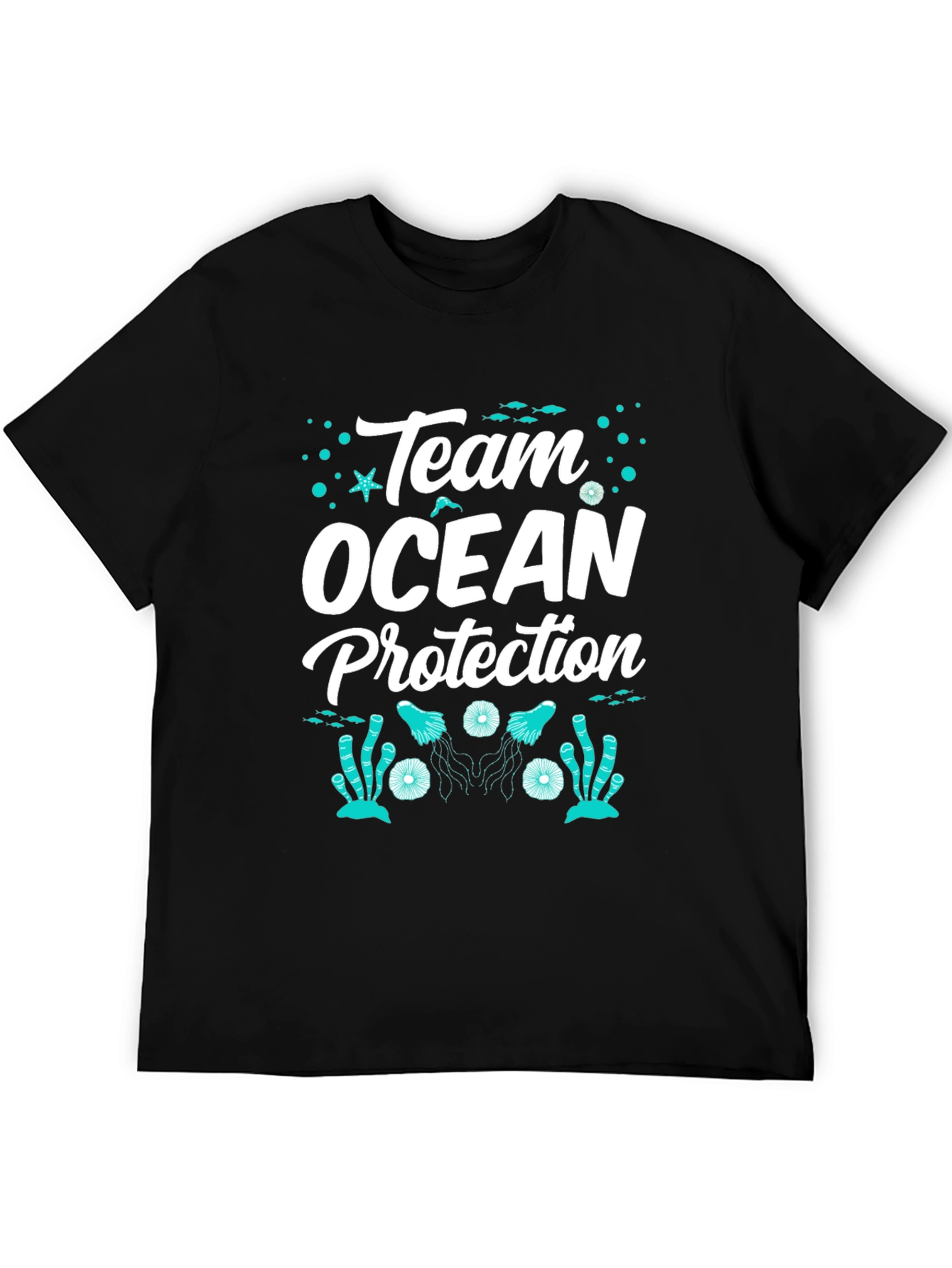 Show your love for the ocean with this stylish black graphic tee! Featuring a bold "Team Ocean Protection" design with a sea life graphic in white and teal colors, this t-shirt is perfect for ocean lovers and conservationists. Made from comfortable materials, it's ideal for everyday wear, beach outings, or casual events. The design incorporates sea creatures like fishes and corals for an eye-catching look. Support marine life protection with style and comfort!