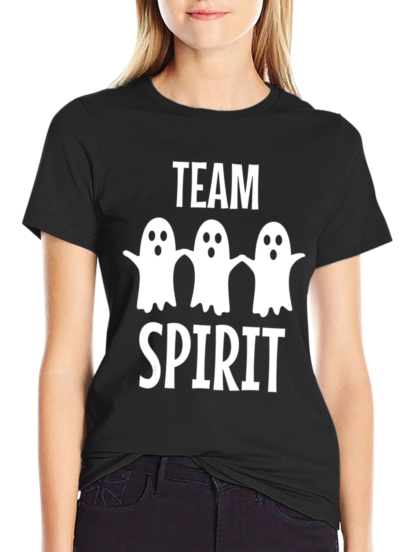 Show your team spirit this Halloween with this fun and festive t-shirt. This black t-shirt features a playful design with three adorable white ghosts holding hands between the words "Team" and "Spirit" in bold white letters. The simple yet eye-catching design is perfect for casual wear during Halloween parties, trick-or-treating, or any fall-themed event. The classic fit makes it comfortable to wear all day long. A great way to show team pride and add some spooky fun to your wardrobe this Halloween!