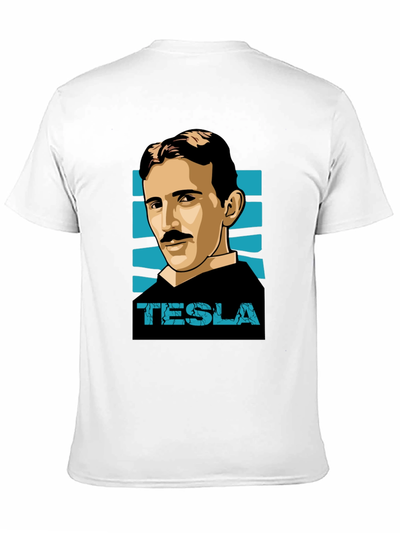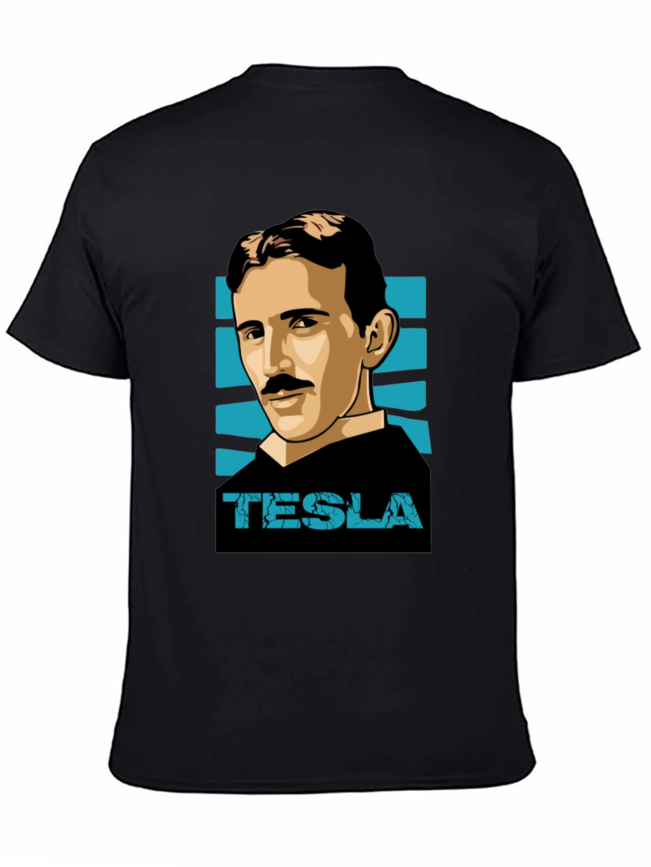 Showcase your love for science and innovation with this striking Tesla graphic t-shirt. The shirt features a bold, stylized portrait of Nikola Tesla set against a vibrant blue backdrop with the name "TESLA" displayed in a cracked, eye-catching font. Made from what appears to be comfortable cotton or a cotton blend, this black, crew-neck tee is perfect for casual wear, science enthusiasts, or anyone who appreciates unique and artistic designs. It's a great conversation starter and a stylish way to pay homage to one of history's greatest inventors. Wear it to school, science events, or simply for everyday style.