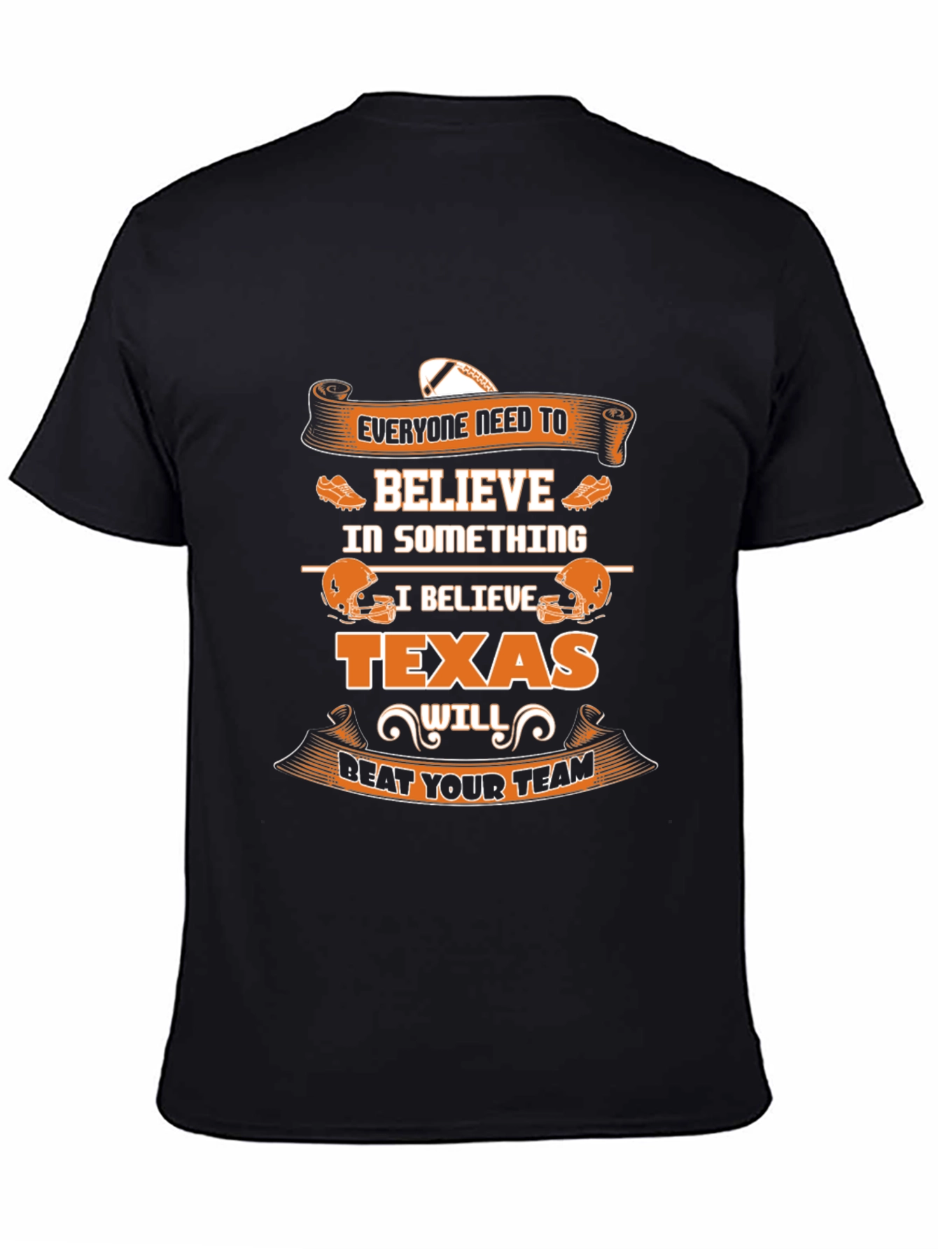 Show your Texas pride with this eye-catching black t-shirt! The bold orange graphic features football helmets, cleats, and a football, framing the confident statement "Everyone Need to Believe In Something. I Believe Texas Will Beat Your Team." Made from comfortable fabric, this tee is perfect for game days, tailgates, or everyday wear. Let everyone know where your allegiance lies and support the Longhorns in style! Makes a great gift for any dedicated Texas football fan. Get yours today and cheer on your team!
