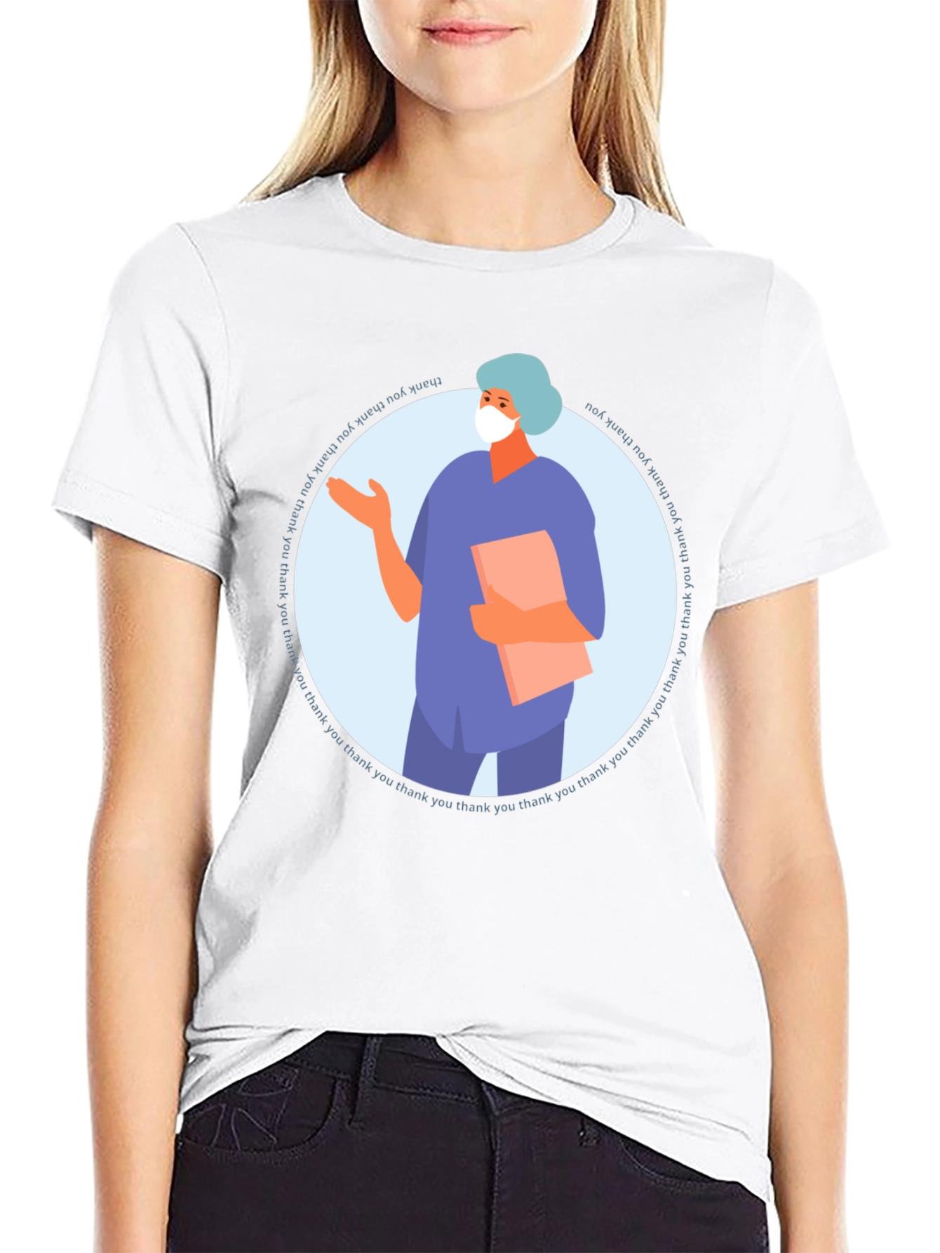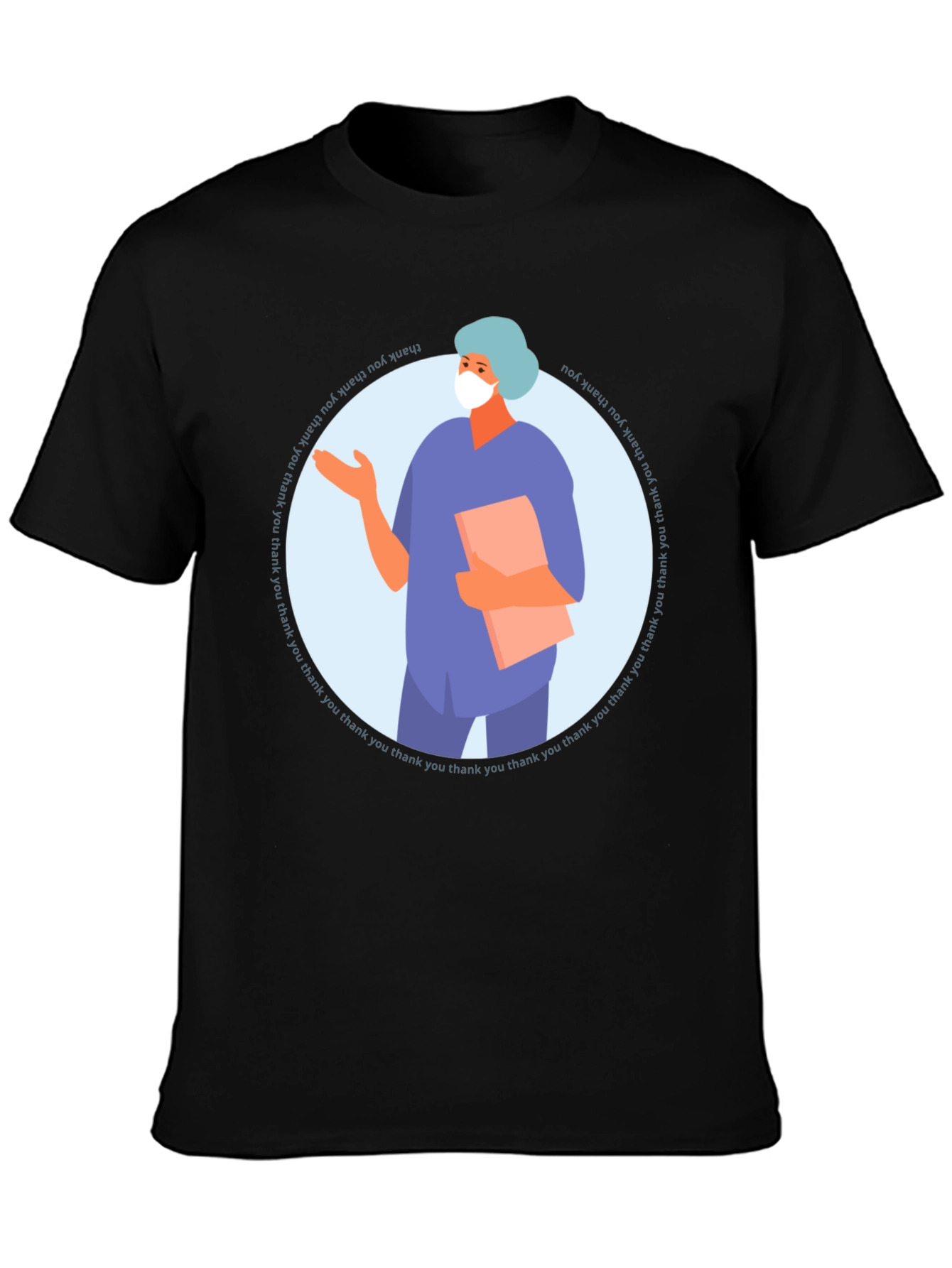 Show your appreciation with this unique graphic t-shirt. The black tee features an illustration of a healthcare worker in scrubs and a face mask, set against a light blue circular backdrop with "thank you" text. This design is a stylish way to express gratitude and support for medical professionals. Made from a comfortable fabric blend, this shirt is perfect for everyday wear. Ideal for casual outings, work events, or as a thoughtful gift. Available in various sizes. Order yours today and make a statement!