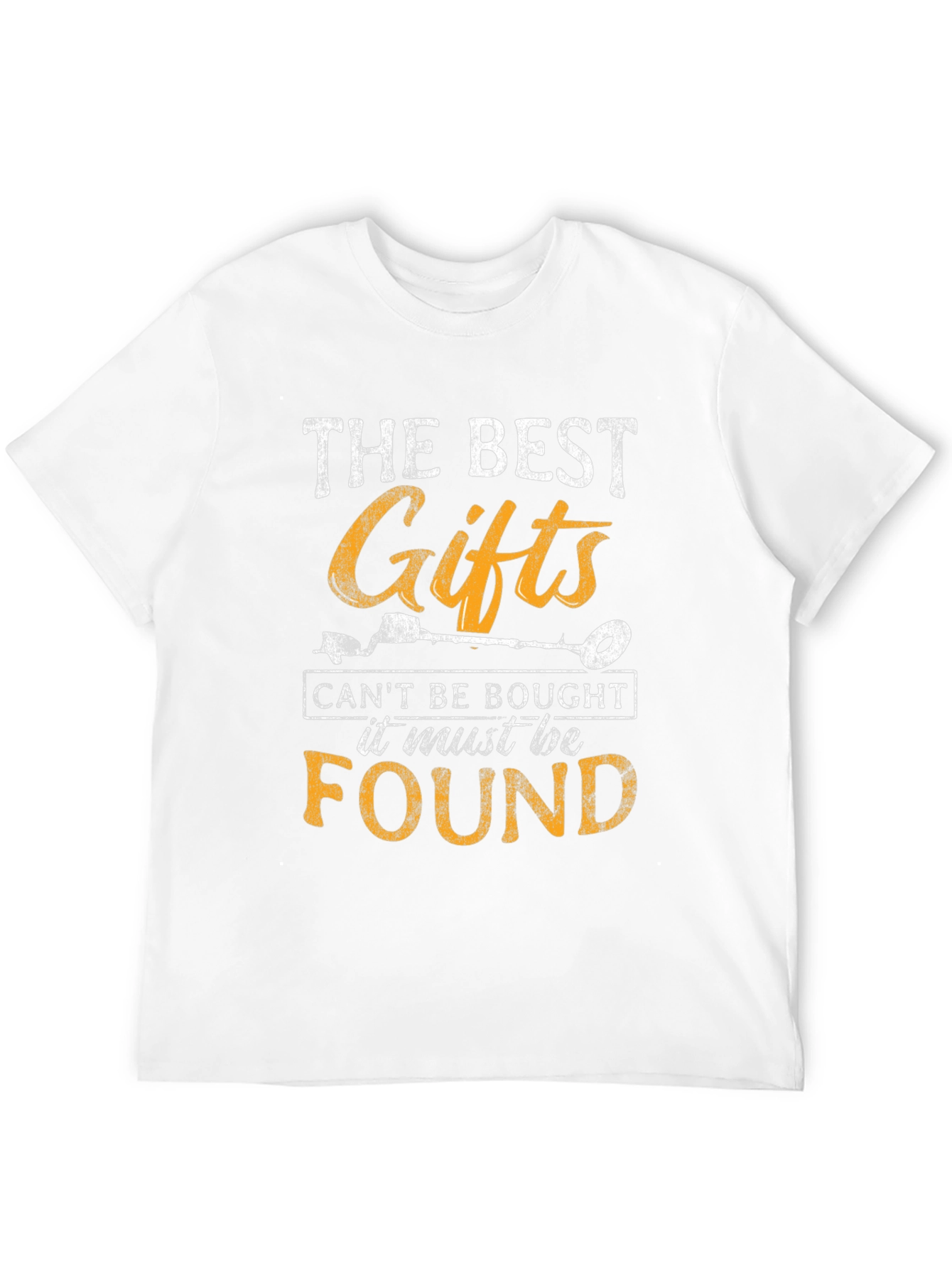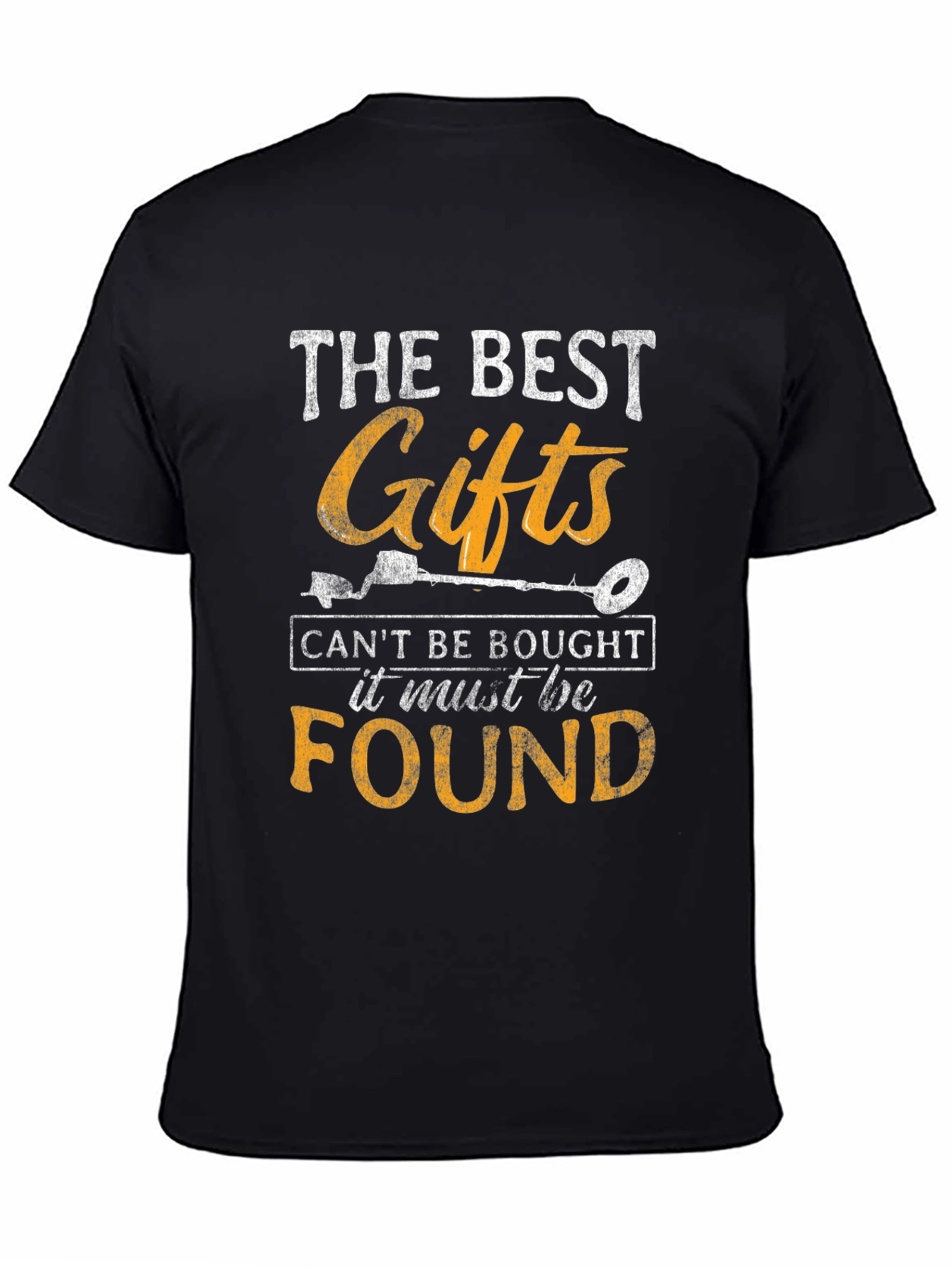 Embrace the thrill of discovery with this unique black graphic tee! Featuring the phrase "The Best Gifts CAN'T BE BOUGHT it must be FOUND" in a distressed white and gold font. A metal detector graphic accents the design. Crafted from a soft-looking fabric, this crewneck t-shirt offers a comfortable and casual fit. Perfect for those who love treasure hunting or appreciate thoughtful presents, this tee is ideal for everyday wear, outdoor adventures, or a fun gift for your favorite explorer. Express your adventurous spirit!