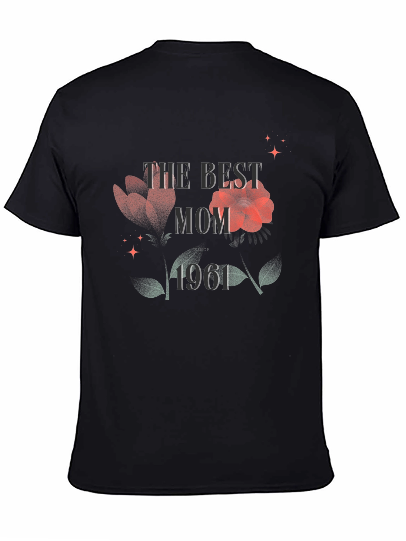 Show your love with this unique "The Best Mom 1961" T-shirt! This black tee features a beautiful floral design with red and green accents, making it a stylish choice for everyday wear. The design incorporates the text in a creative way, blending vintage charm with contemporary style. Made from comfortable fabric, this T-shirt is perfect for casual outings, family gatherings, or as a thoughtful gift for mom. Celebrate her with this standout piece that combines sentiment and fashion seamlessly. Get yours now and make her feel special!