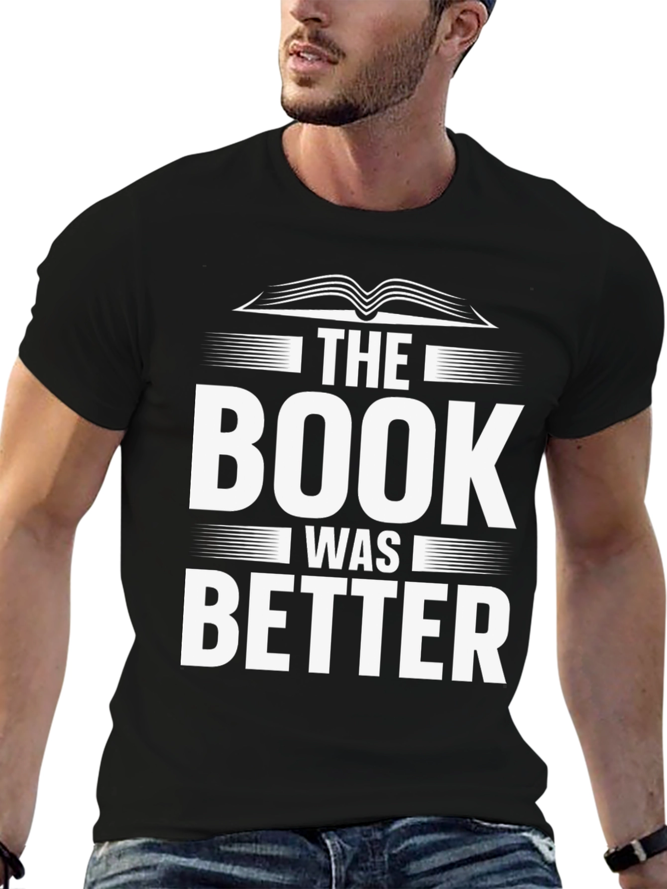 This black t-shirt features a bold, white graphic design that proclaims, "THE BOOK WAS BETTER." The design includes an open book illustration at the top. Made from what appears to be a comfortable cotton blend, this short-sleeved tee offers a relaxed fit perfect for casual wear. Ideal for book lovers and avid readers, it's a great conversation starter. Wear it to book clubs, libraries, or while simply relaxing with a good book. A stylish and witty way to express your literary preference.