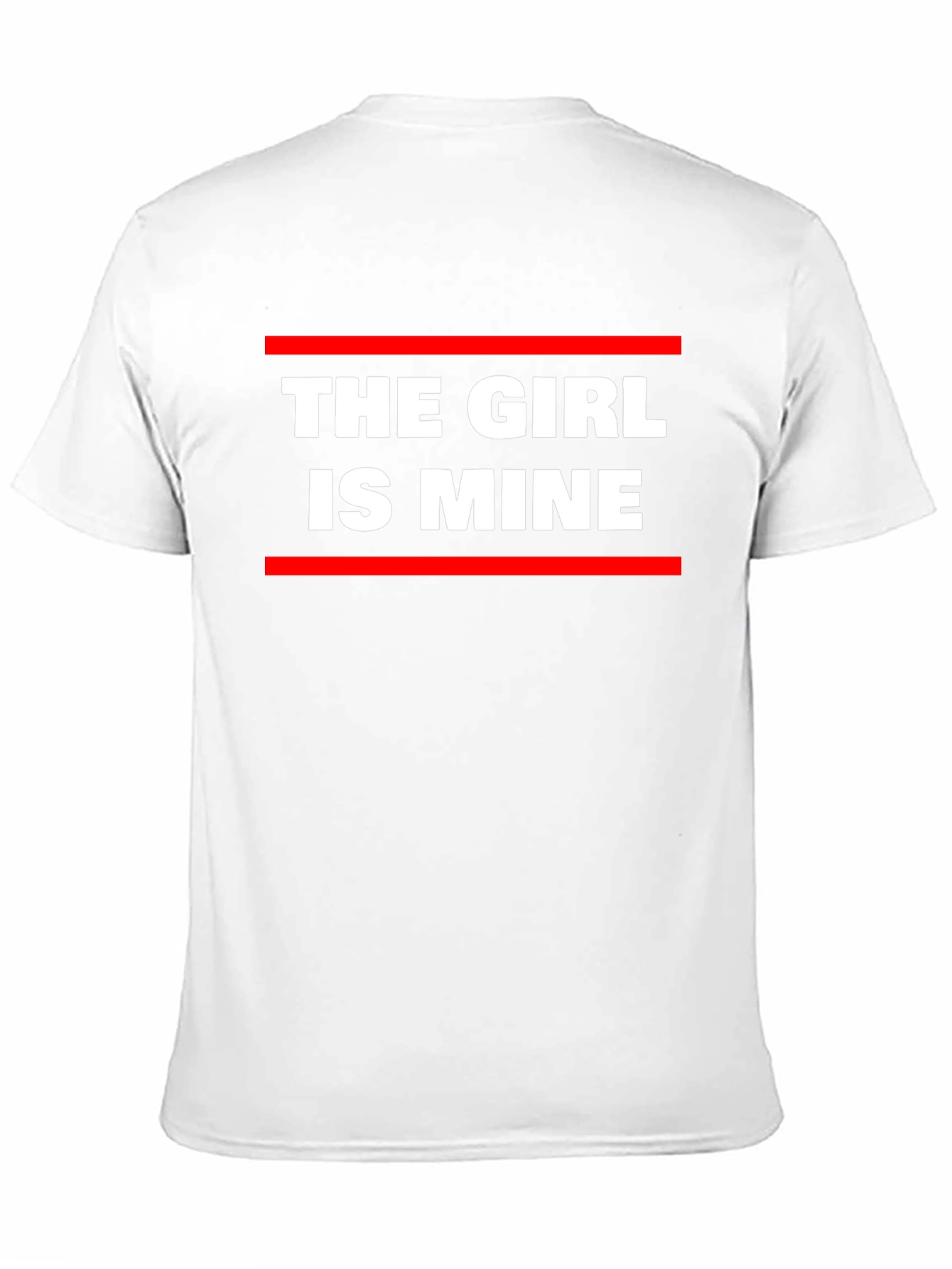 Declare your status with this bold 'The Girl Is Mine' graphic tee! This black t-shirt features a striking design with the phrase 'THE GIRL IS MINE' in large, white block letters, punctuated by bold red stripes above and below. Made from what appears to be a soft and comfortable cotton blend, this shirt is perfect for casual wear and making a statement. Show off your playful side and claim your territory with this humorous and attention-grabbing t-shirt.