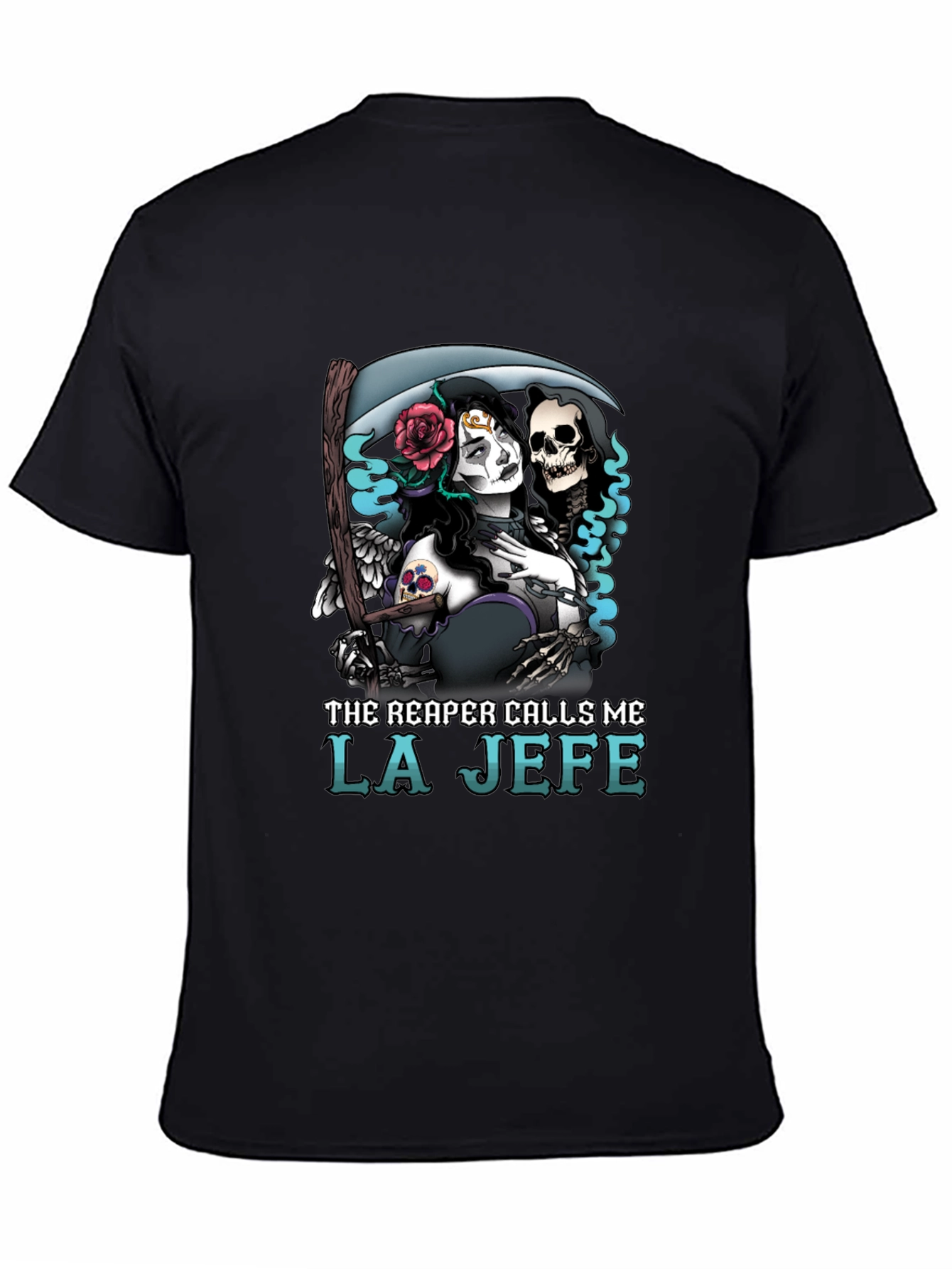 Embrace edgy style with this black graphic tee. Featuring a striking design of a Day of the Dead-inspired female figure alongside the grim reaper, adorned with roses and chains. The bold 'THE REAPER CALLS ME LA JEFE' print adds a touch of rebellious flair. Made from comfortable fabric, this tee is perfect for casual wear, concerts, or making a statement. Pair with jeans and boots for an effortlessly cool look. Own your unique style with this standout t-shirt!