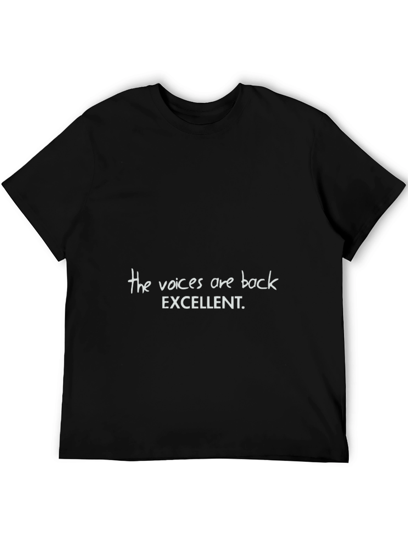 This classic black t-shirt features a humorous slogan, "The voices are back EXCELLENT." in a simple, clean font. The shirt is made of what appears to be a soft, comfortable material, perfect for everyday wear. The short sleeves and casual design make it a versatile addition to any wardrobe. Ideal for those with a quirky sense of humor, this tee is sure to spark conversations and bring a smile to those around you. Wear it to casual outings, parties, or simply when lounging at home for a fun and relaxed look. The bold statement adds a unique touch and is a great way to express your personality with style.