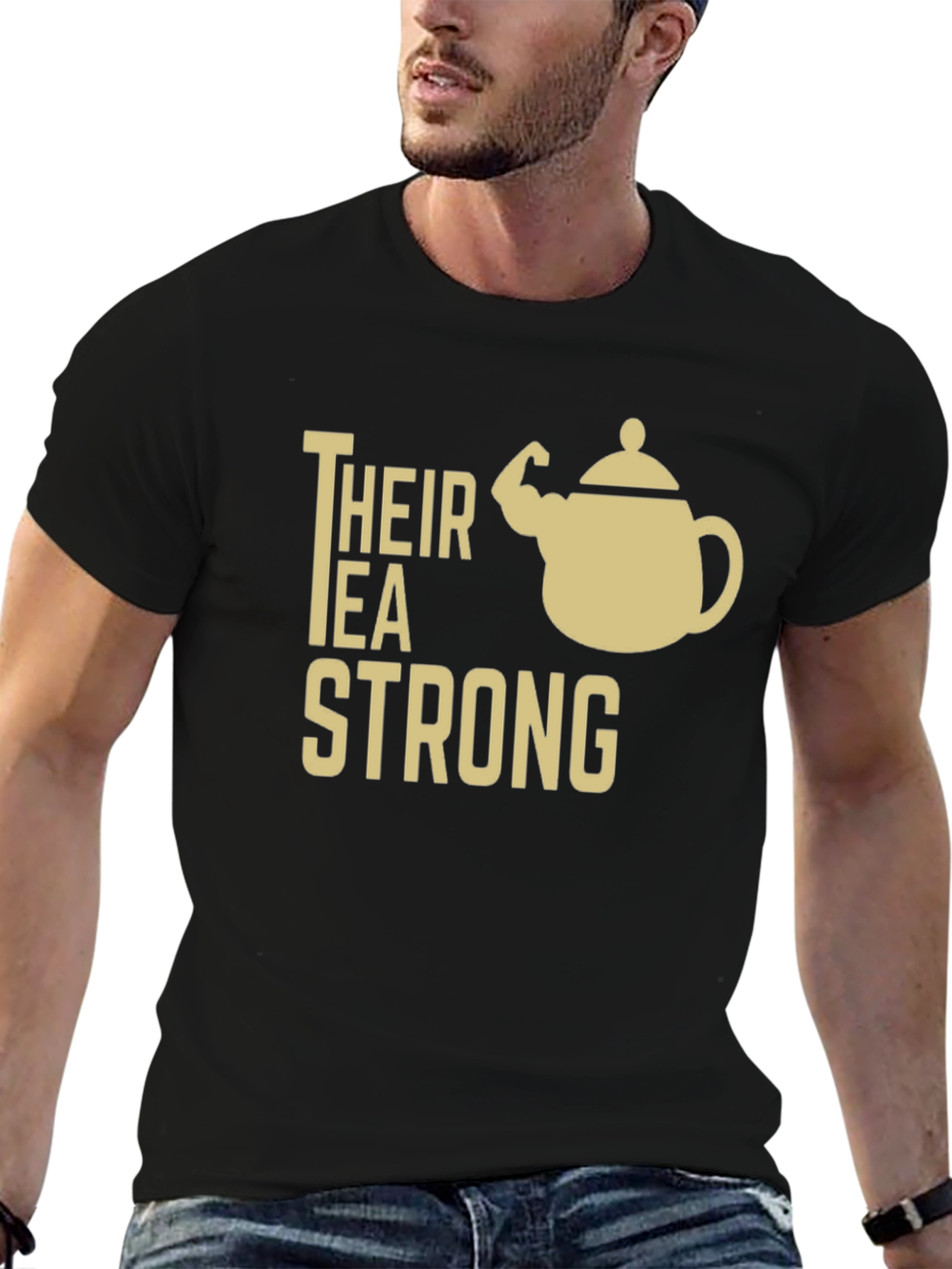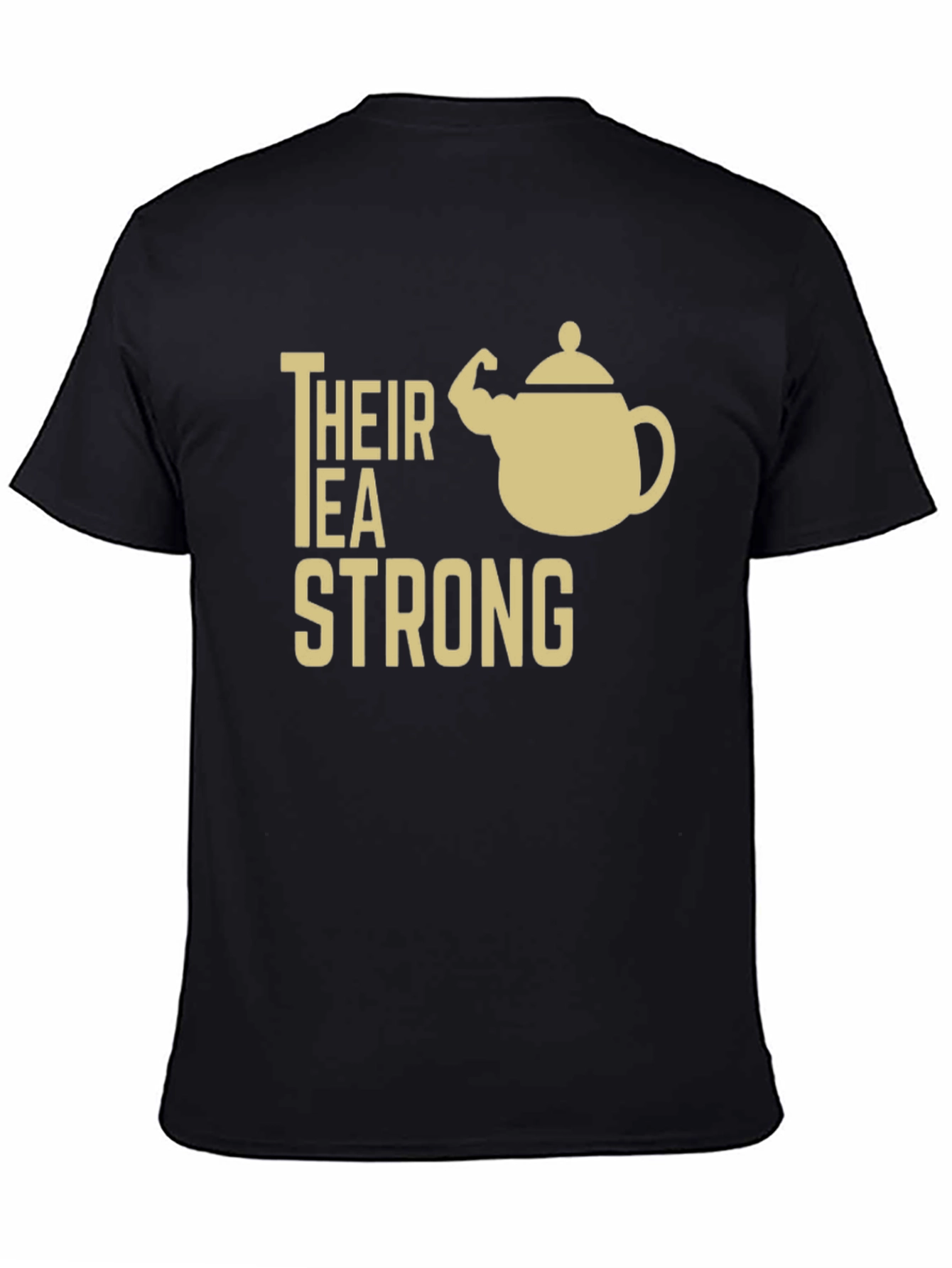 Show off your love for tea and humor with this unique graphic t-shirt! The shirt features a playful design with the phrase 'Their Tea Strong' accompanied by a teapot graphic with a muscular arm, perfect for tea enthusiasts with a sense of humor. Made from a comfortable, likely cotton blend, this black t-shirt offers a relaxed fit for everyday wear. Whether you're sipping tea at home, hanging out with friends, or just want to make a statement, this shirt is sure to spark conversations and bring a smile to faces. It is a great gift for tea lovers.