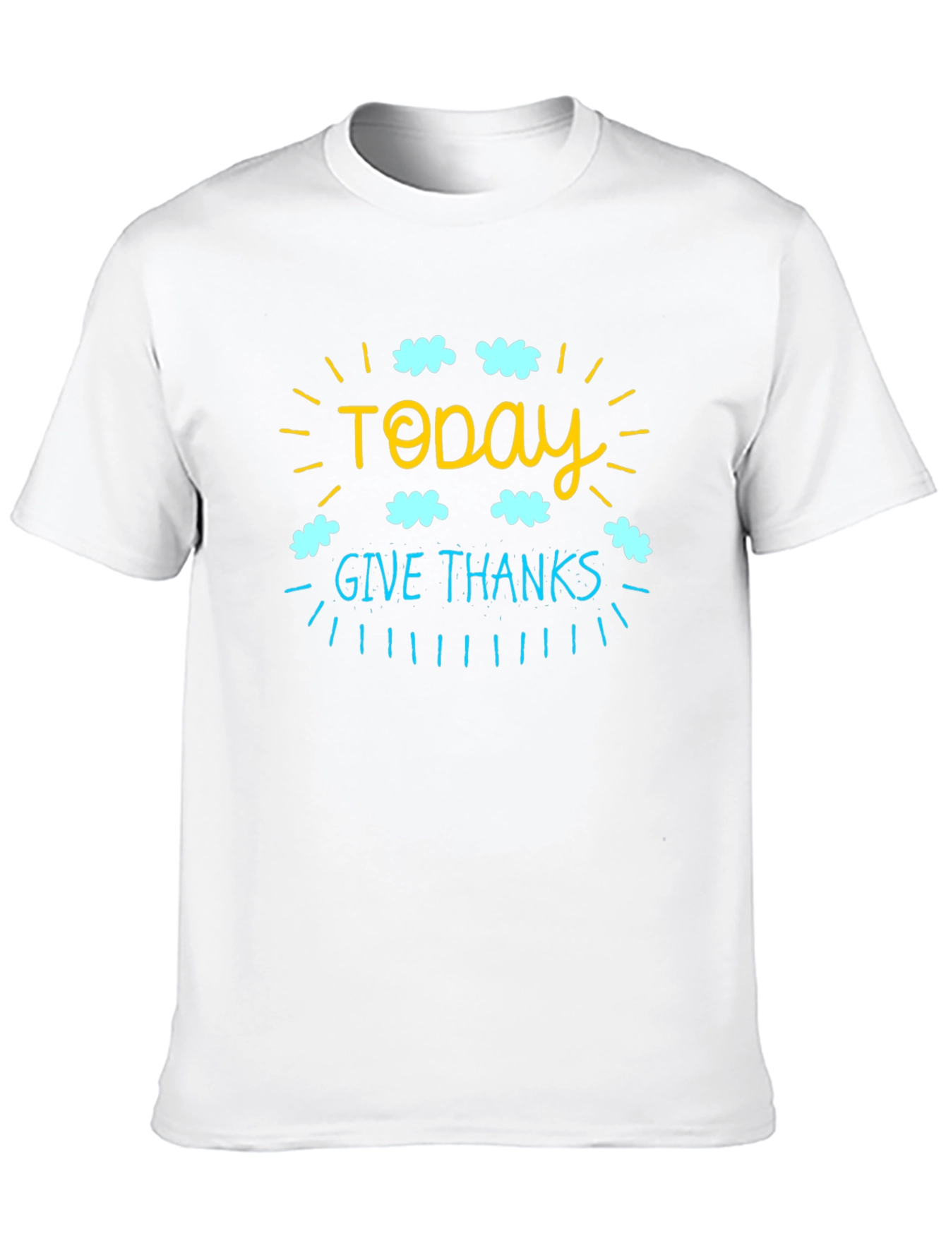Celebrate gratitude with this stylish black t-shirt! The front features a vibrant, eye-catching graphic design that says "TODAY GIVE THANKS" in a playful, hand-lettered style. The design incorporates a mix of yellow and turquoise colors, creating a fun and inviting look. Made from a soft, comfortable fabric, this tee is perfect for casual wear. Show your appreciation for life's blessings in style with this unique and cheerful t-shirt. It's an ideal choice for Thanksgiving gatherings, casual outings, or simply expressing a positive outlook on life. Add a touch of positivity to your wardrobe!