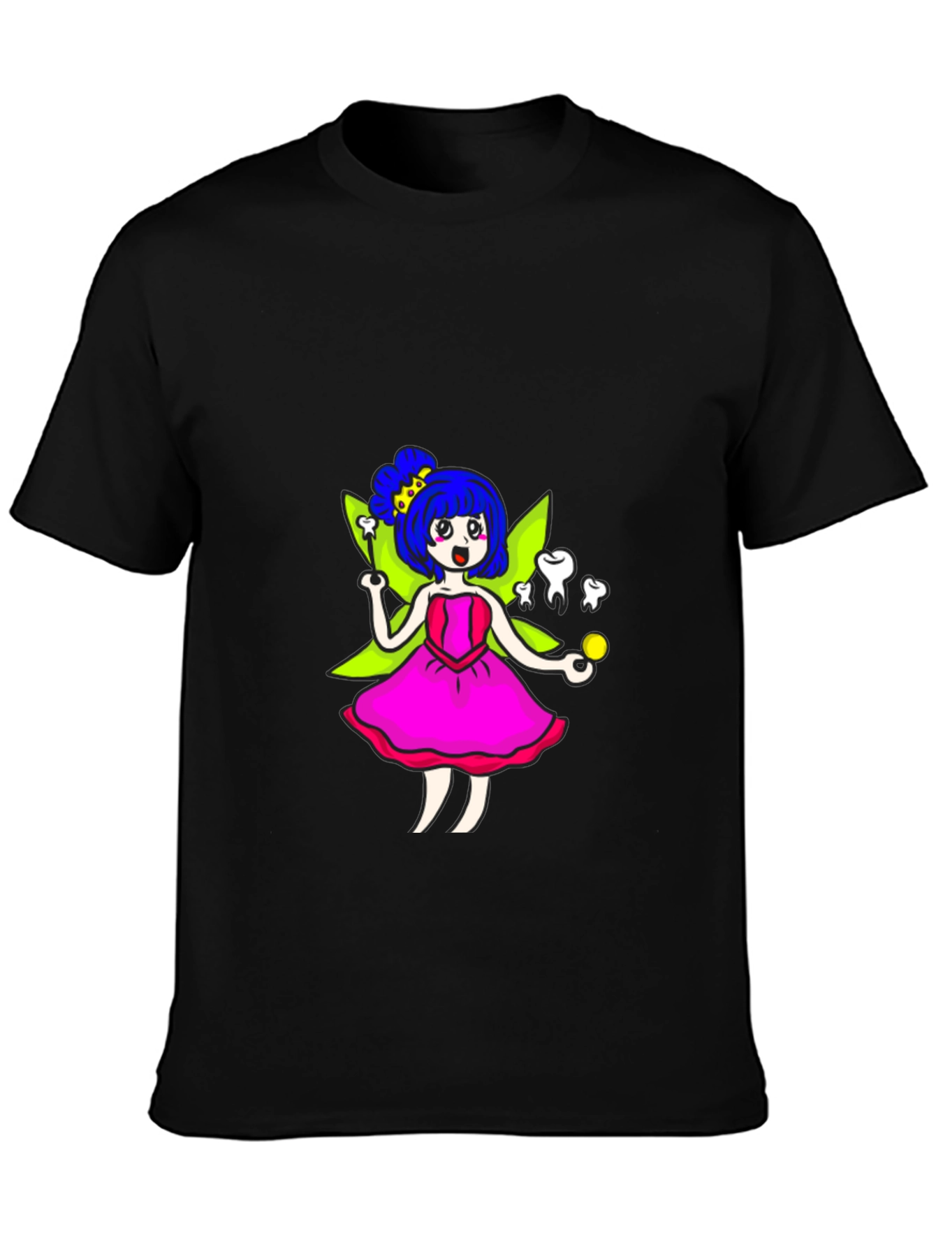 This black T-shirt features a fun and whimsical cartoon graphic of a tooth fairy. The design includes a fairy with blue hair, a pink dress, green wings, and a wand, surrounded by cartoon teeth. Made from comfortable material, this T-shirt is perfect for casual wear or as a fun gift for anyone who loves quirky designs and dental themes. The vibrant colors and playful illustration make it a standout piece. Great for everyday wear, costume parties, or adding a touch of humor to your wardrobe.