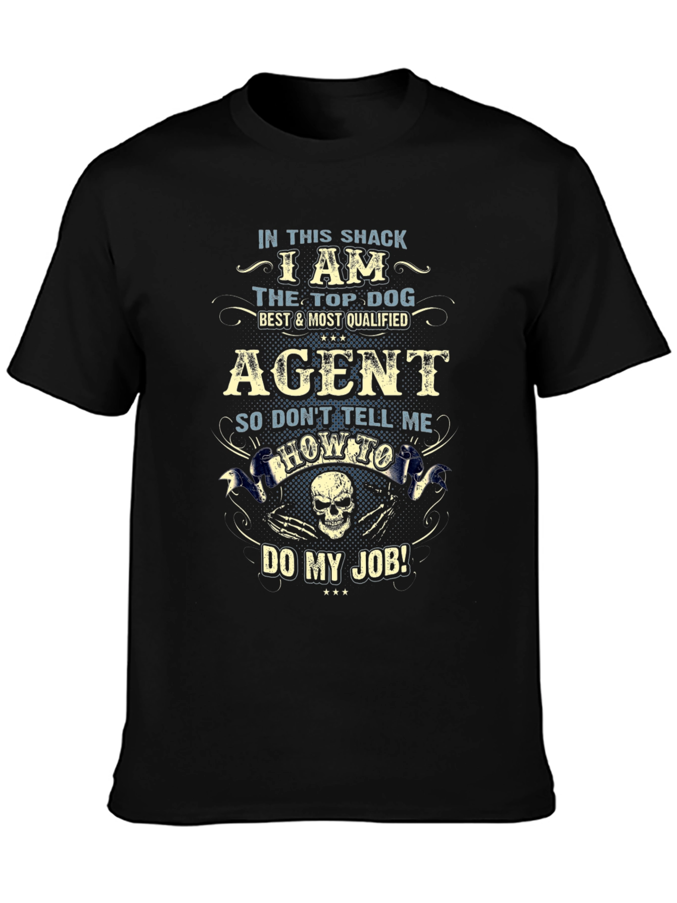 Show off your professional edge with this bold black t-shirt! Featuring a striking design, the shirt proudly declares "In This Shack I am the Top Dog Agent, Best & Most Qualified." A skull graphic with skeletal hands adds a touch of edgy humor. Made from comfortable material, it's ideal for casual wear, agent events, or making a statement at the office. Tell the world you know your job and you do it well, without any unsolicited advice. Perfect for confident agents.