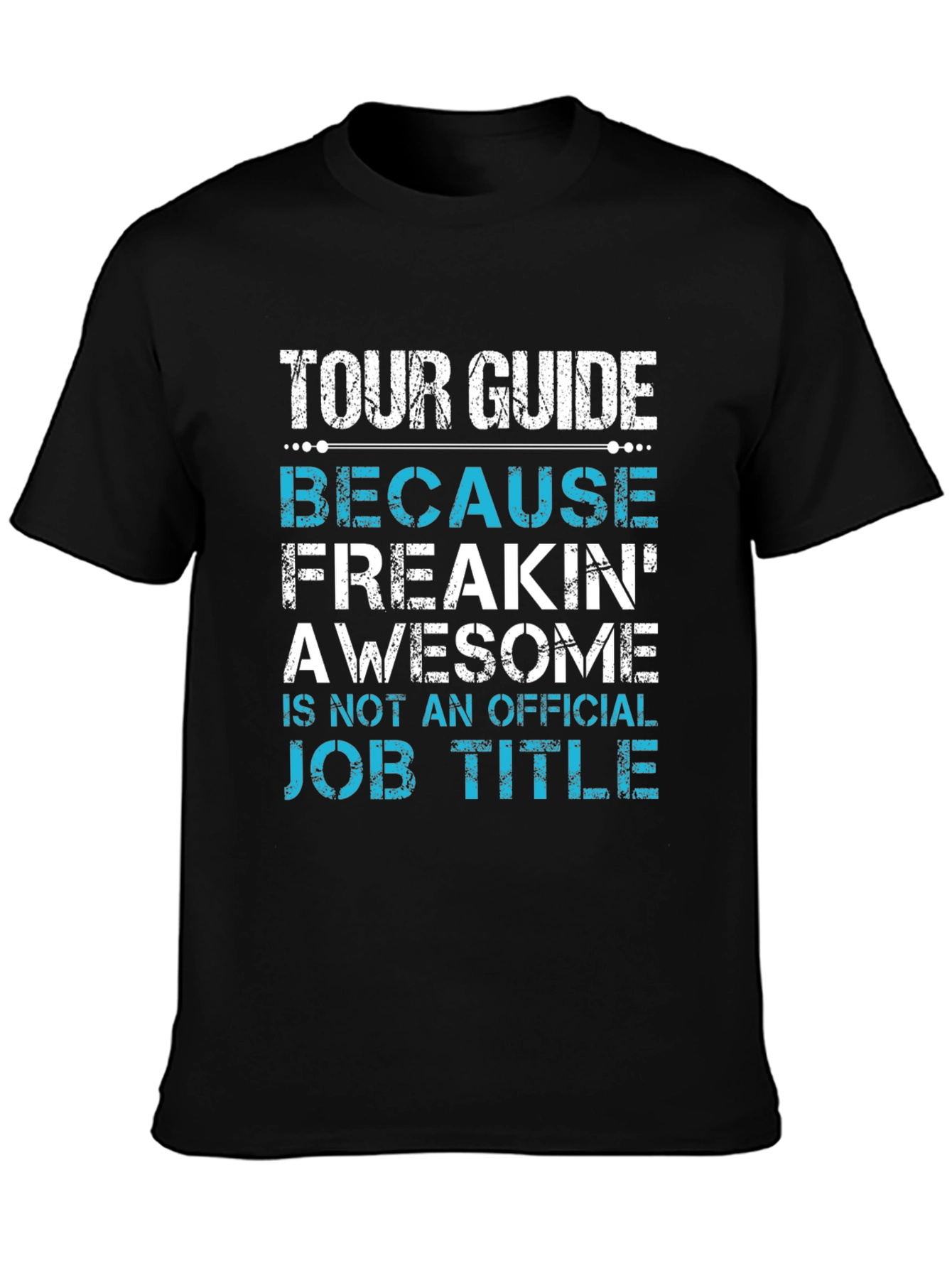 Show off your pride in being a tour guide with this unique t-shirt! This black tee features a bold graphic design that reads, "TOUR GUIDE" in white, followed by "BECAUSE FREAKIN' AWESOME IS NOT AN OFFICIAL JOB TITLE" in blue. The distressed font gives it a cool, vintage vibe. Made from comfortable fabric, this tee is perfect for casual wear, work, or even while leading tours. It's a fun way to express your passion for your job and make a statement. Get yours today and let everyone know that you're a proud and awesome tour guide!