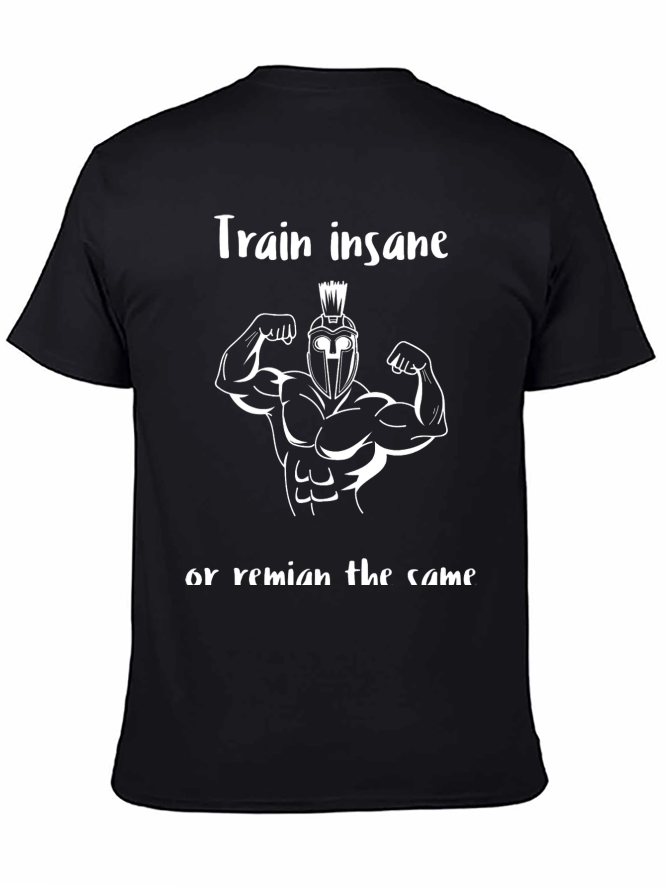 This black t-shirt features a bold design with the phrase "Train insane or remain the same." The design incorporates a stylized image of a muscular warrior, conveying strength and motivation. Made from a soft fabric, this tee offers both comfort and durability, making it ideal for workouts or casual wear. The print is a white graphic making it stand out against the black shirt. Showcase your commitment to fitness and a powerful mindset with this eye-catching t-shirt, a perfect addition to your activewear collection or a great gift for the fitness enthusiast in your life.