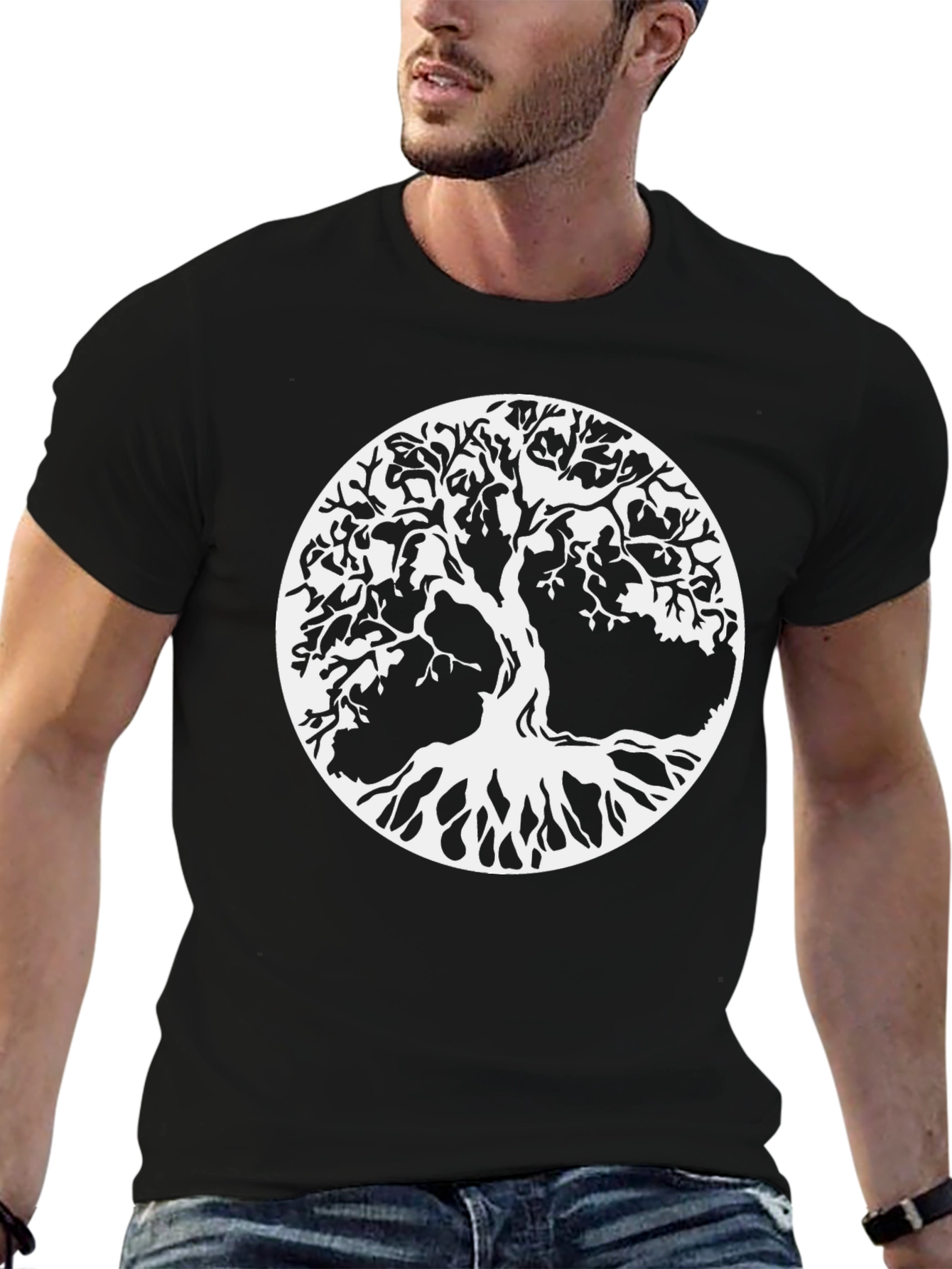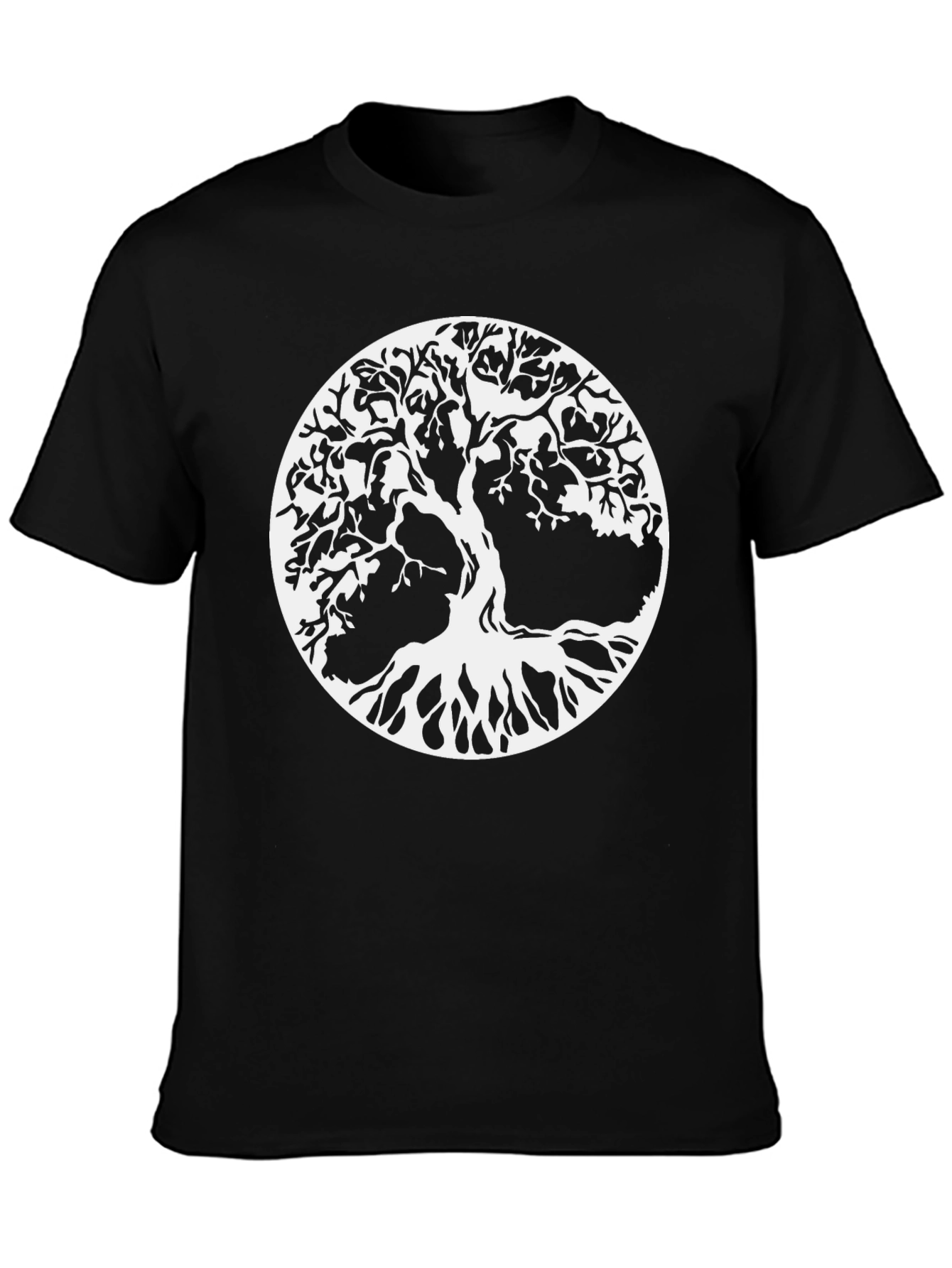 Embrace nature-inspired style with this striking black t-shirt. The tee features a large, white graphic of the Tree of Life, displayed in a circular frame. Crafted from a comfortable-looking fabric, this short-sleeve shirt offers a classic fit. The design makes it a great addition to any wardrobe. Ideal for casual outings, everyday wear, or as a statement piece. Show off your love for nature with this must-have graphic tee. Upgrade your look and get yours today!