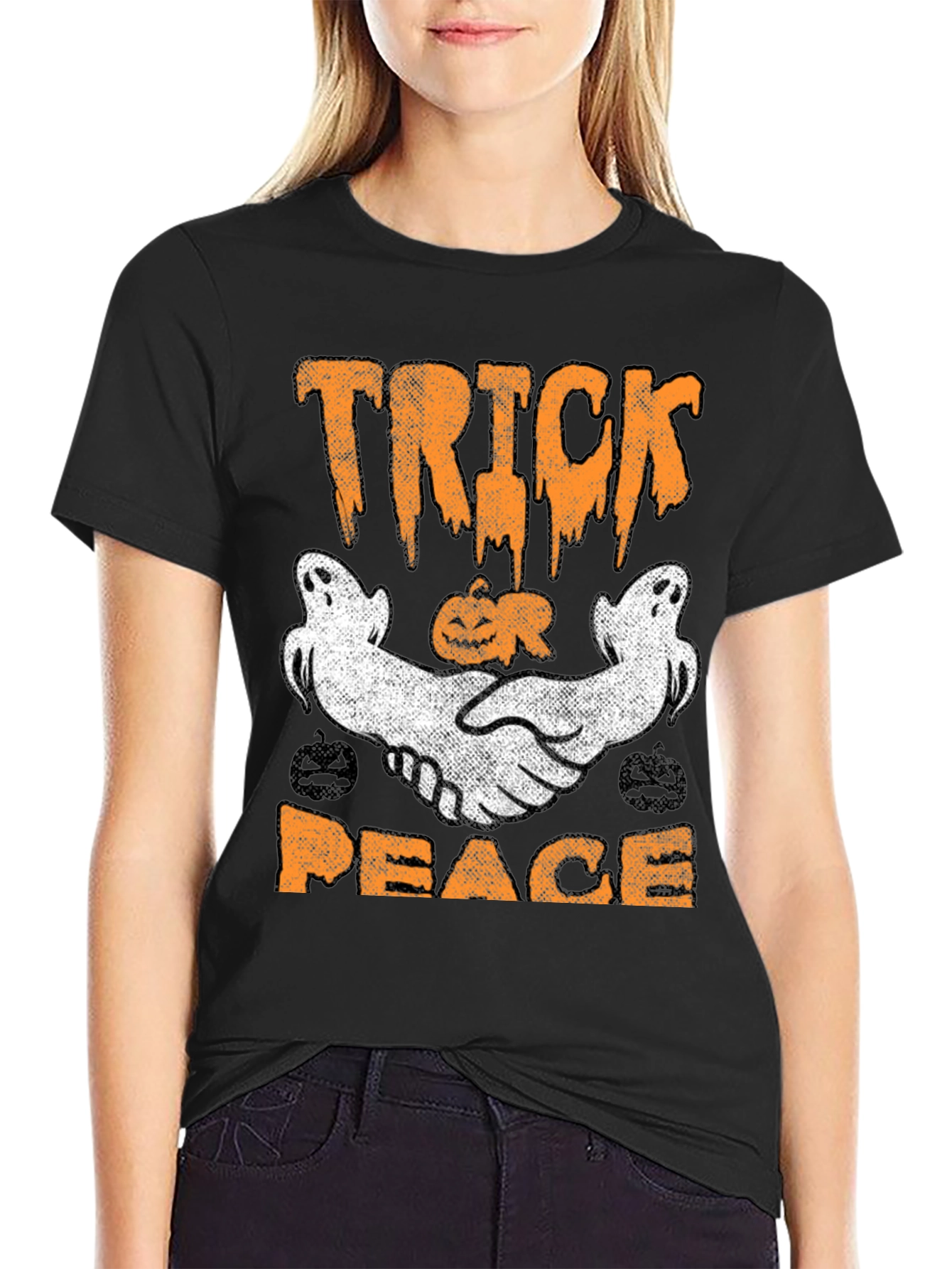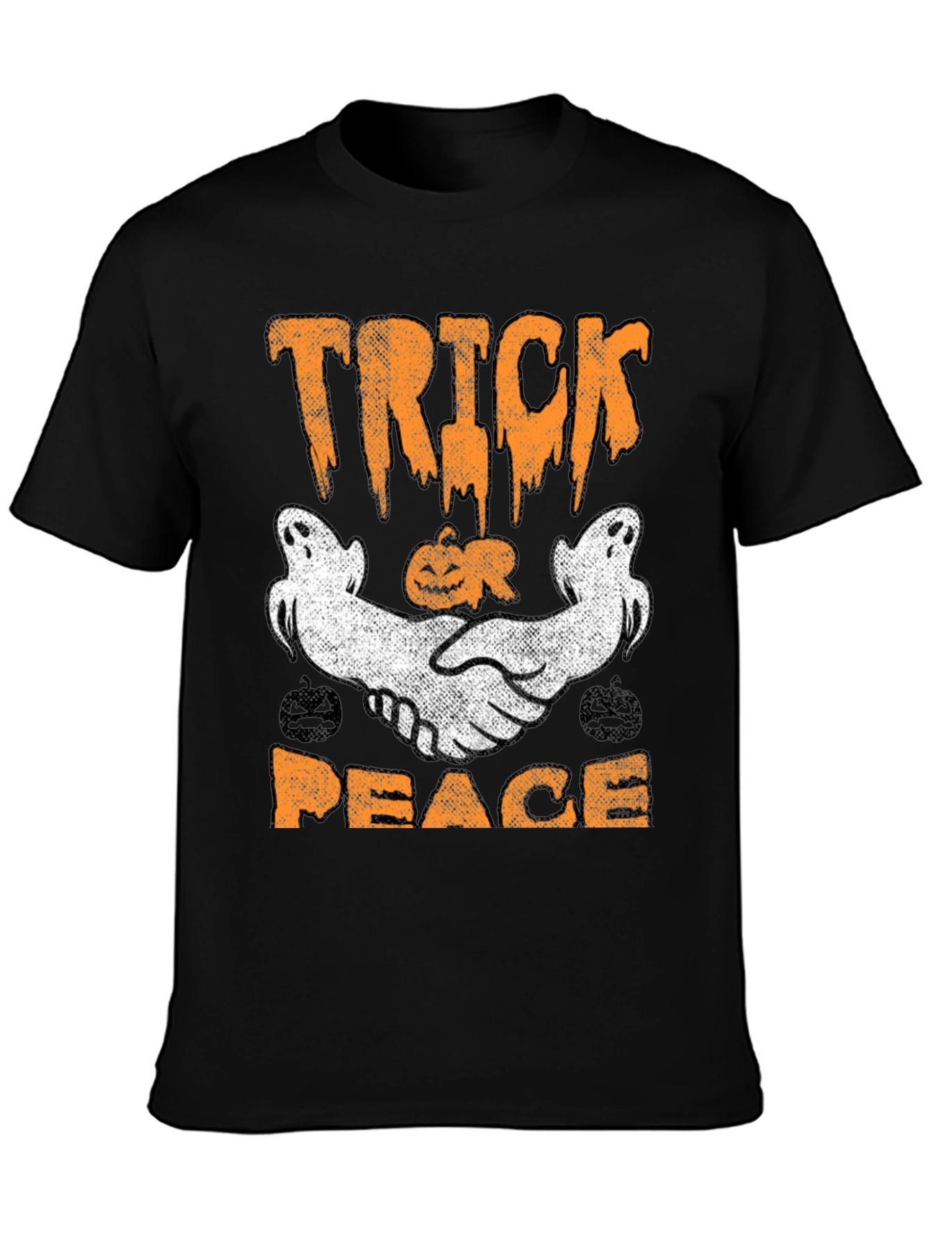 Embrace the spooky season with this unique Halloween t-shirt! Featuring the words 'Trick' and 'Peace' in distressed orange font, this black tee has a playful, Halloween-themed design. Two ghostly figures form a handshake, punctuated by a carved pumpkin in the center, creating a memorable image. Perfect for casual wear during Halloween festivities, costume parties, or everyday fun. Show off your spooky sense of humor with this eye-catching graphic tee. Made with comfortable materials for all-day wear, get yours now!