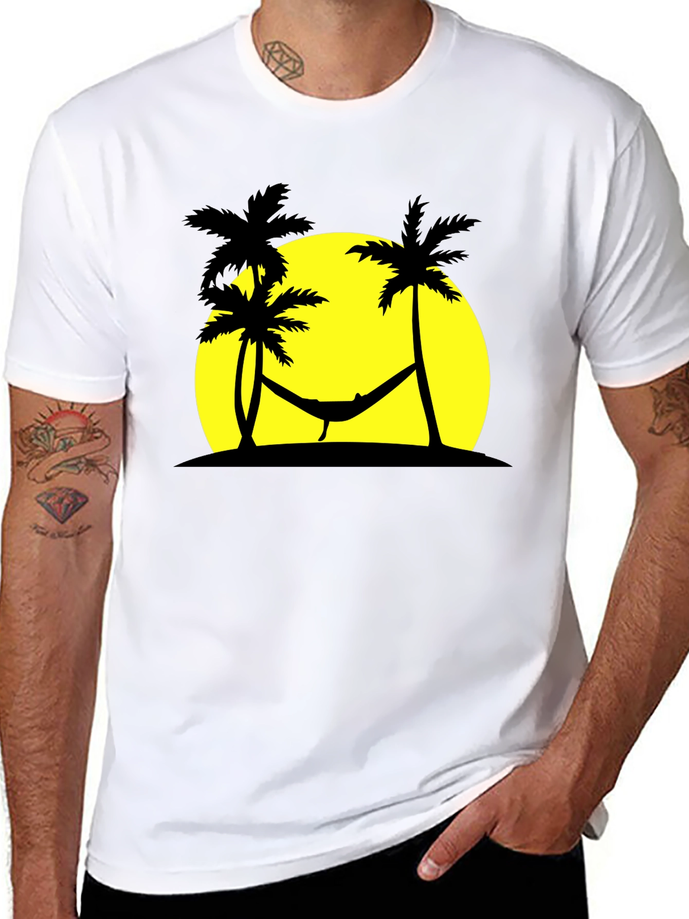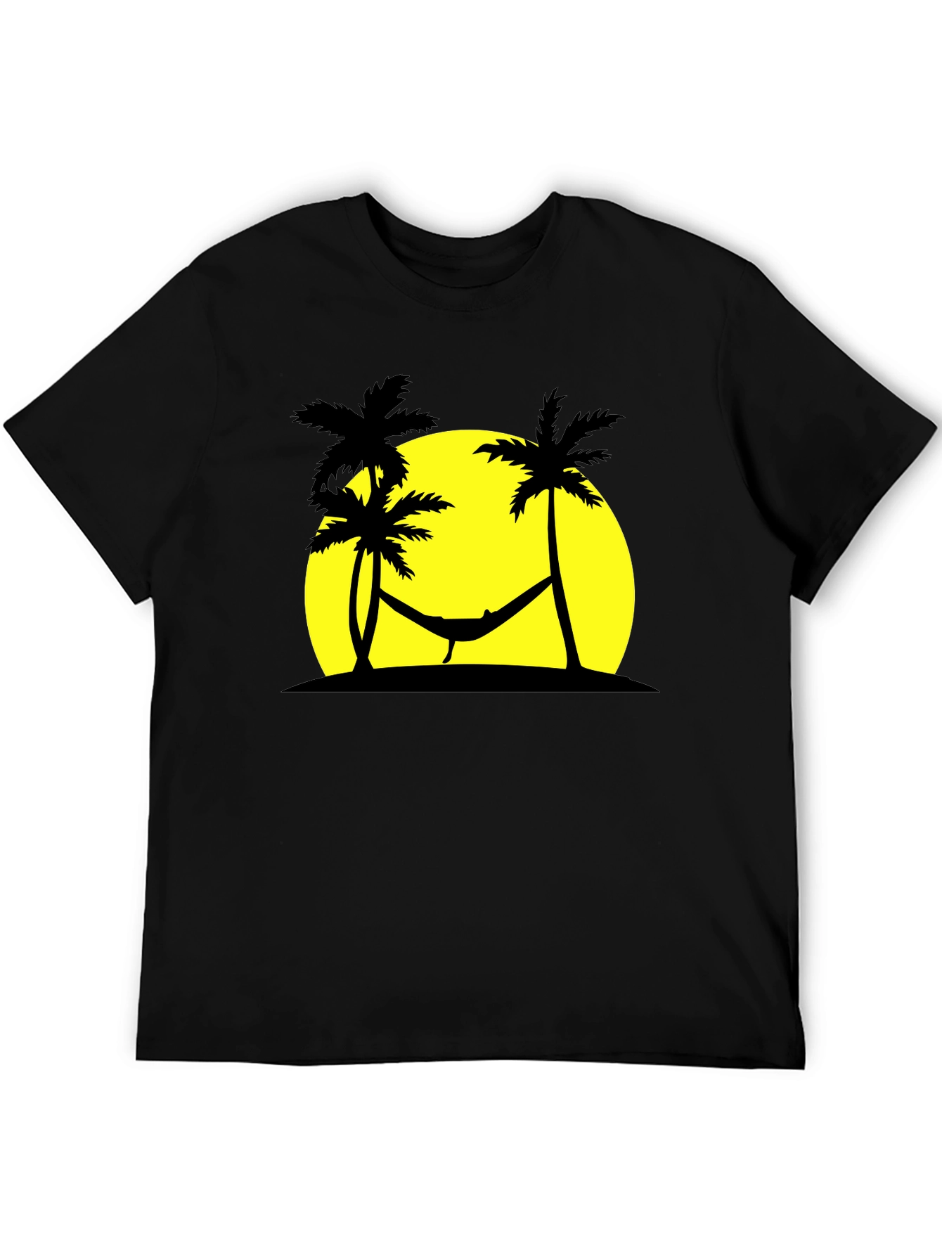 This stylish black t-shirt features a silhouette design of a hammock strung between palm trees against a vibrant yellow setting sun. The design evokes relaxation and tropical getaways, making it perfect for casual wear. Made from a comfortable-looking fabric, this shirt offers both style and comfort. It is ideal for vacation, summer outings, or simply expressing a laid-back attitude. The classic fit makes it versatile enough to pair with jeans, shorts, or chinos for any occasion. Add a touch of paradise to your wardrobe with this unique and eye-catching tee.