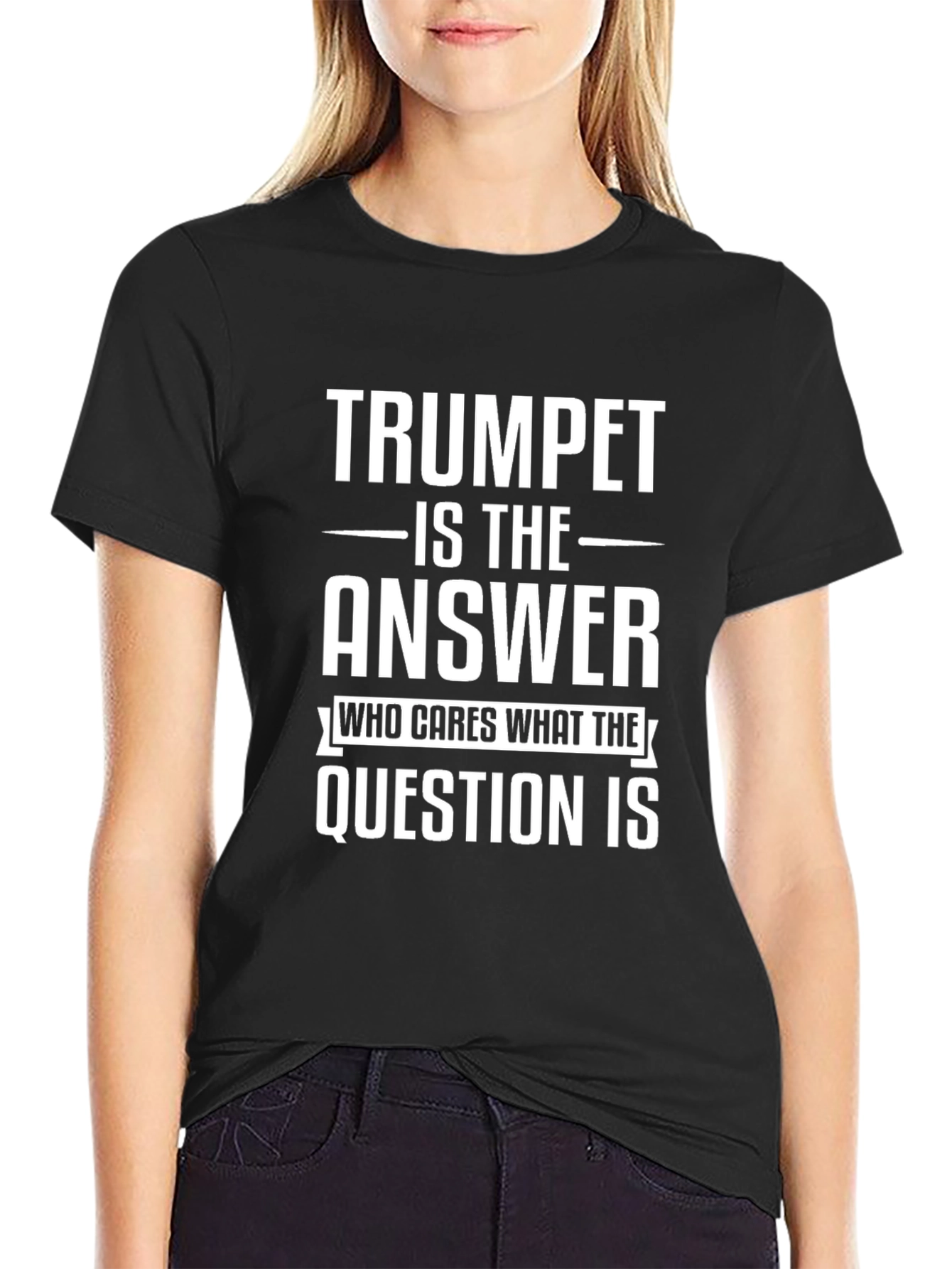 This black t-shirt features a bold, white graphic print that's sure to resonate with music lovers, especially those with a passion for the trumpet. The phrase 'TRUMPET IS THE ANSWER' is prominently displayed in a strong, sans-serif font, followed by the witty addition 'WHO CARES WHAT THE QUESTION IS'. This shirt is perfect for casual wear, music events, band practice, or simply expressing your love for the trumpet. Made from a soft-looking fabric, this tee offers both comfort and style, making it a standout piece in any wardrobe. Grab yours today and let everyone know where your musical heart lies!