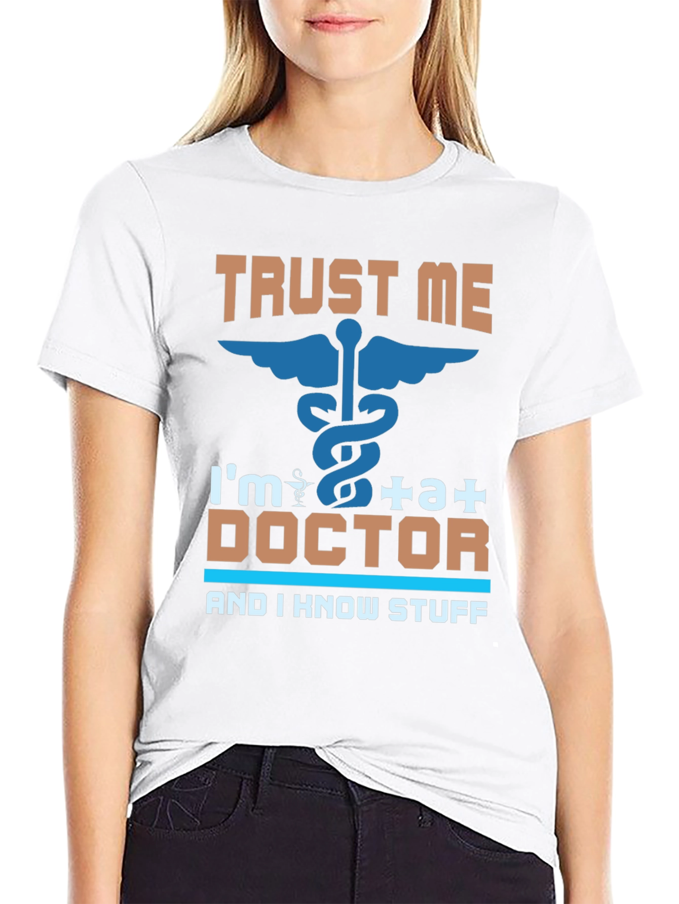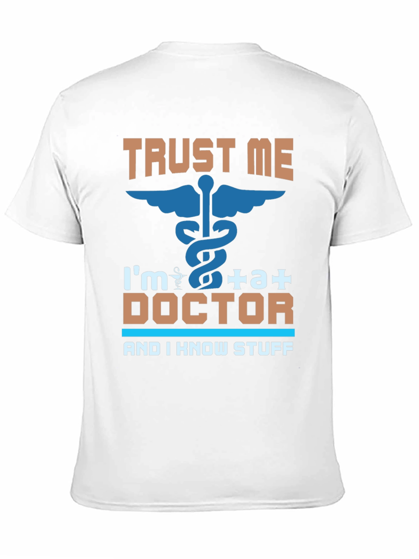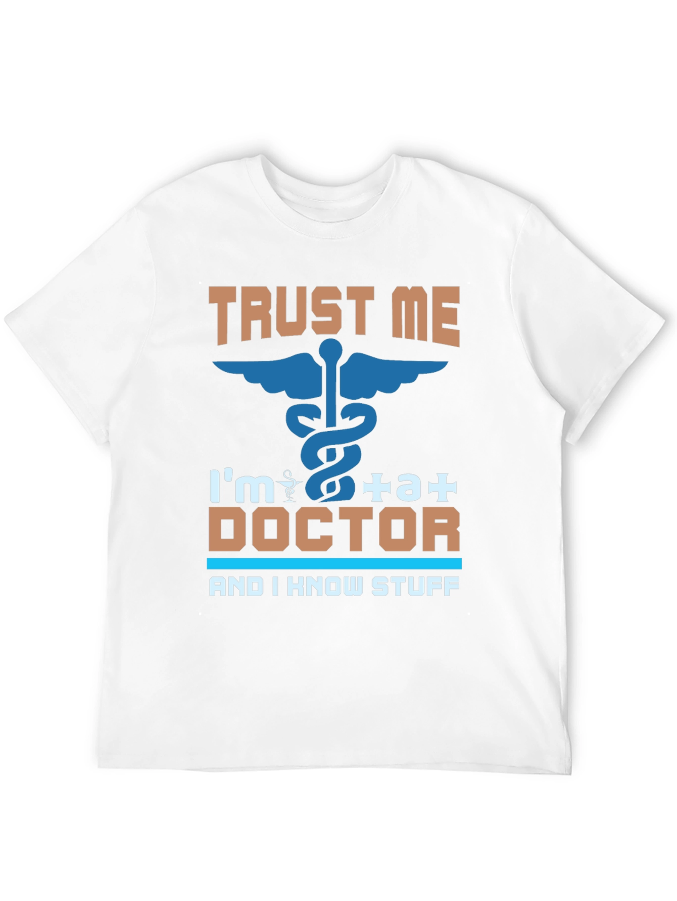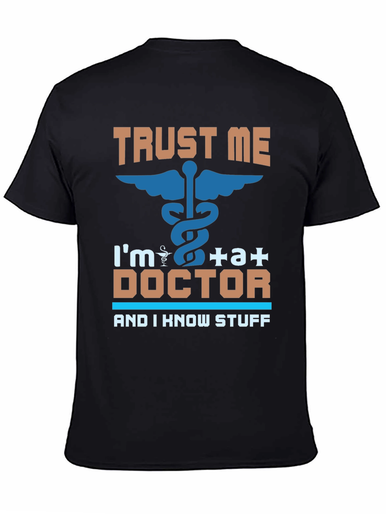 This black t-shirt features a humorous design perfect for medical professionals. The design includes the phrase "TRUST ME" in a brown block font above a blue caduceus symbol. Below the symbol, the phrase "I'm a DOCTOR" is printed in a coordinating brown block font, while "AND I KNOW STUFF" is printed in blue. This tee is a great way for doctors to show off their sense of humor. Made from comfortable materials, this shirt is ideal for casual wear, medical conferences, or as a fun gift for your favorite physician.