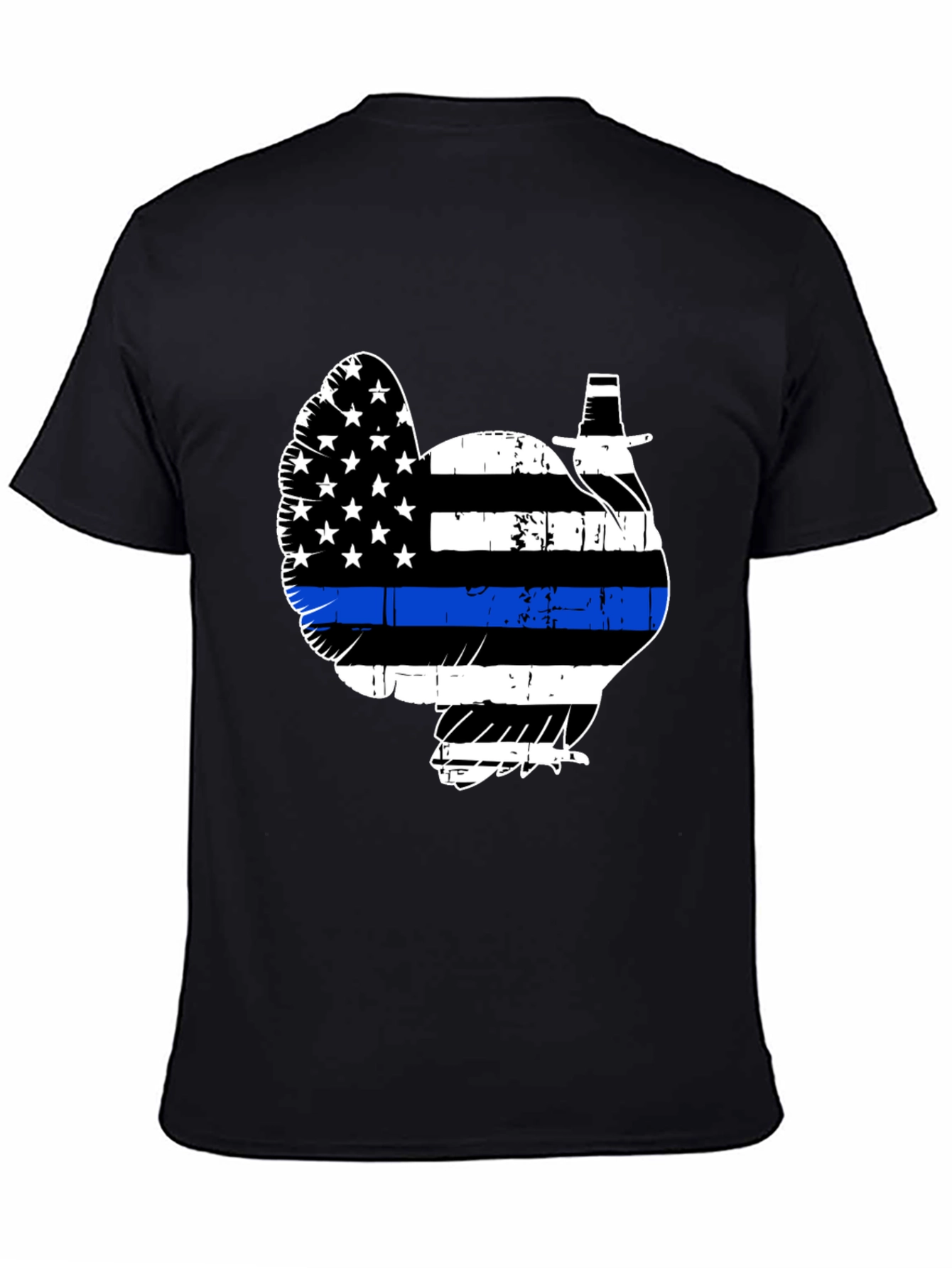 Show your support for law enforcement this Thanksgiving with this unique t-shirt. This black tee features a distressed American flag turkey graphic with a prominent thin blue line, symbolizing the courage and sacrifice of police officers. The turkey design also includes a pilgrim hat for a festive touch. Made from a comfortable fabric, this shirt is perfect for Thanksgiving gatherings, police support events, or everyday wear to display your appreciation. A meaningful and stylish way to give thanks and show solidarity with our men and women in blue.
