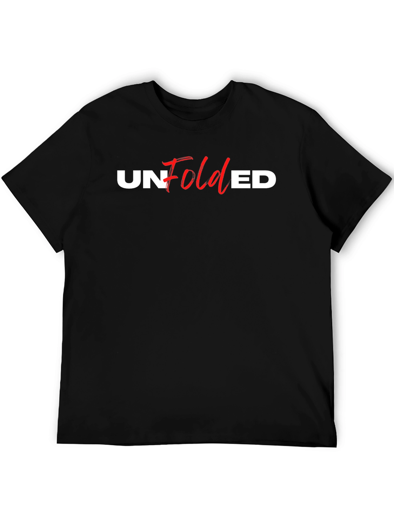 Show off your unique style with this sleek black t-shirt featuring a bold graphic print. The design spells out 'UNFoldED' with 'UN' and 'ED' in a crisp white font, while the word 'Fold' is presented in a stylish red script, creating an eye-catching contrast. Made from what appears to be soft and breathable cotton or a cotton blend, this tee offers both comfort and durability. This versatile t-shirt can be easily paired with jeans, shorts, or casual trousers for a relaxed yet fashionable look. Perfect for everyday wear, casual outings, or as a statement piece. The classic fit makes it suitable for all body types. Make a statement without saying a word!