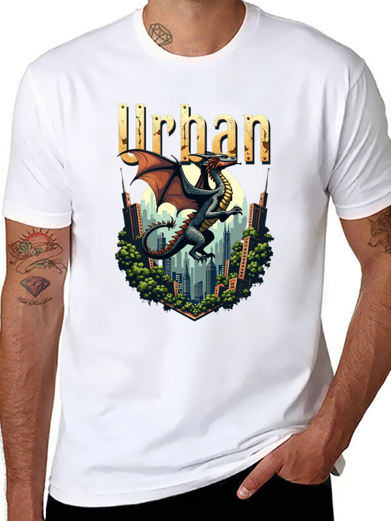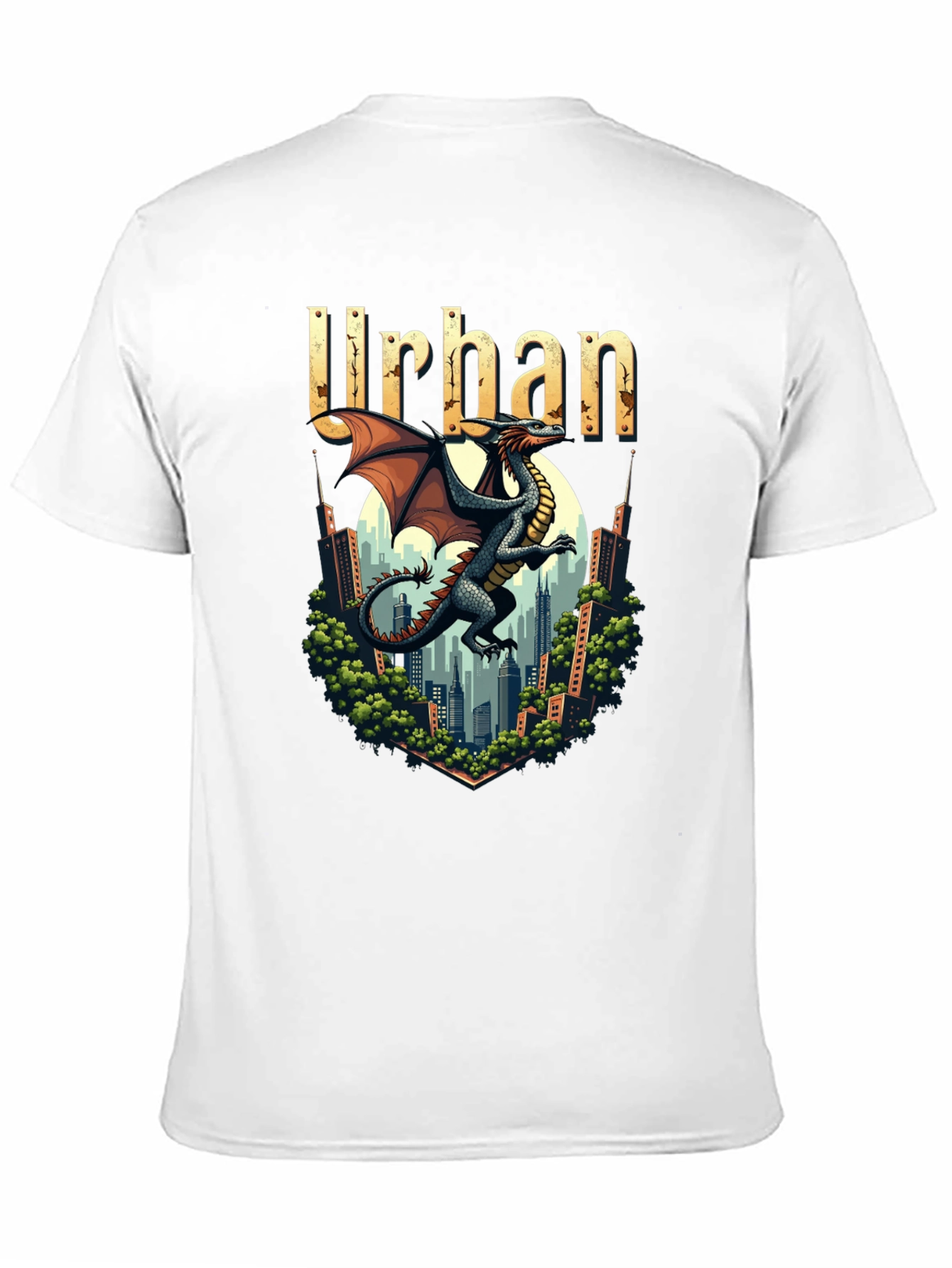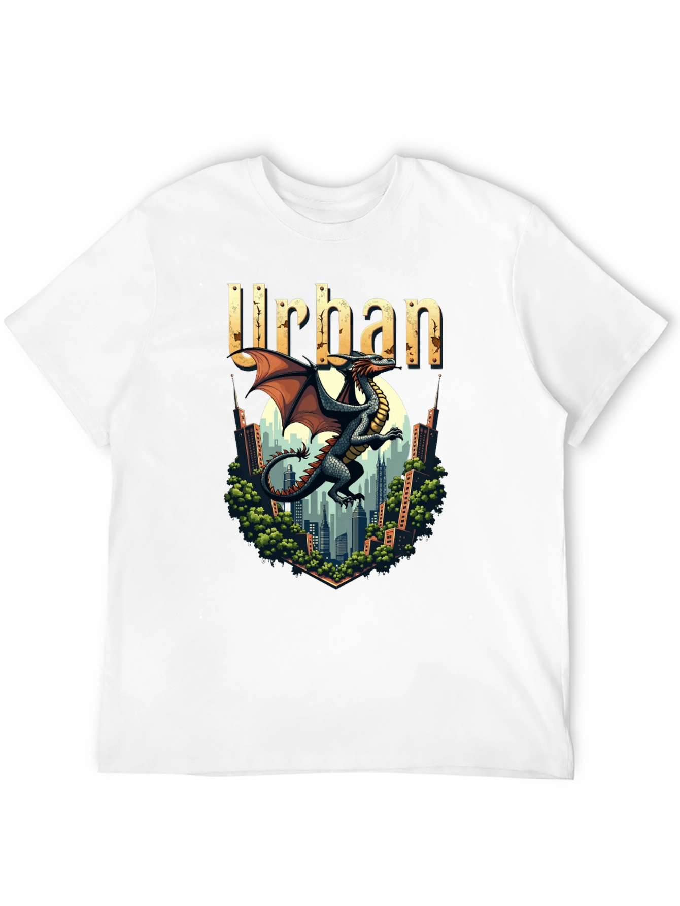 Show off your edgy style with this black graphic tee! Featuring a striking dragon illustration set against an urban cityscape background, topped with the word 'Urban', this shirt is a unique statement piece. The detailed design showcases a cool, mythical vibe perfect for casual wear. Made from a soft, comfortable fabric blend, this tee ensures both style and comfort. Ideal for everyday wear, concerts, or hanging out with friends. Add this standout tee to your wardrobe and unleash your inner dragon!