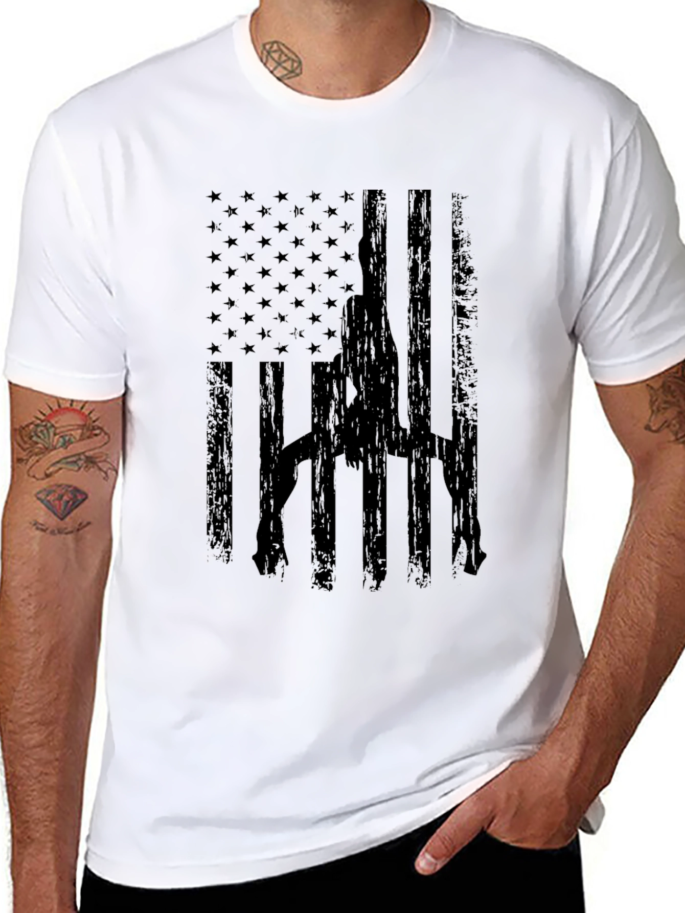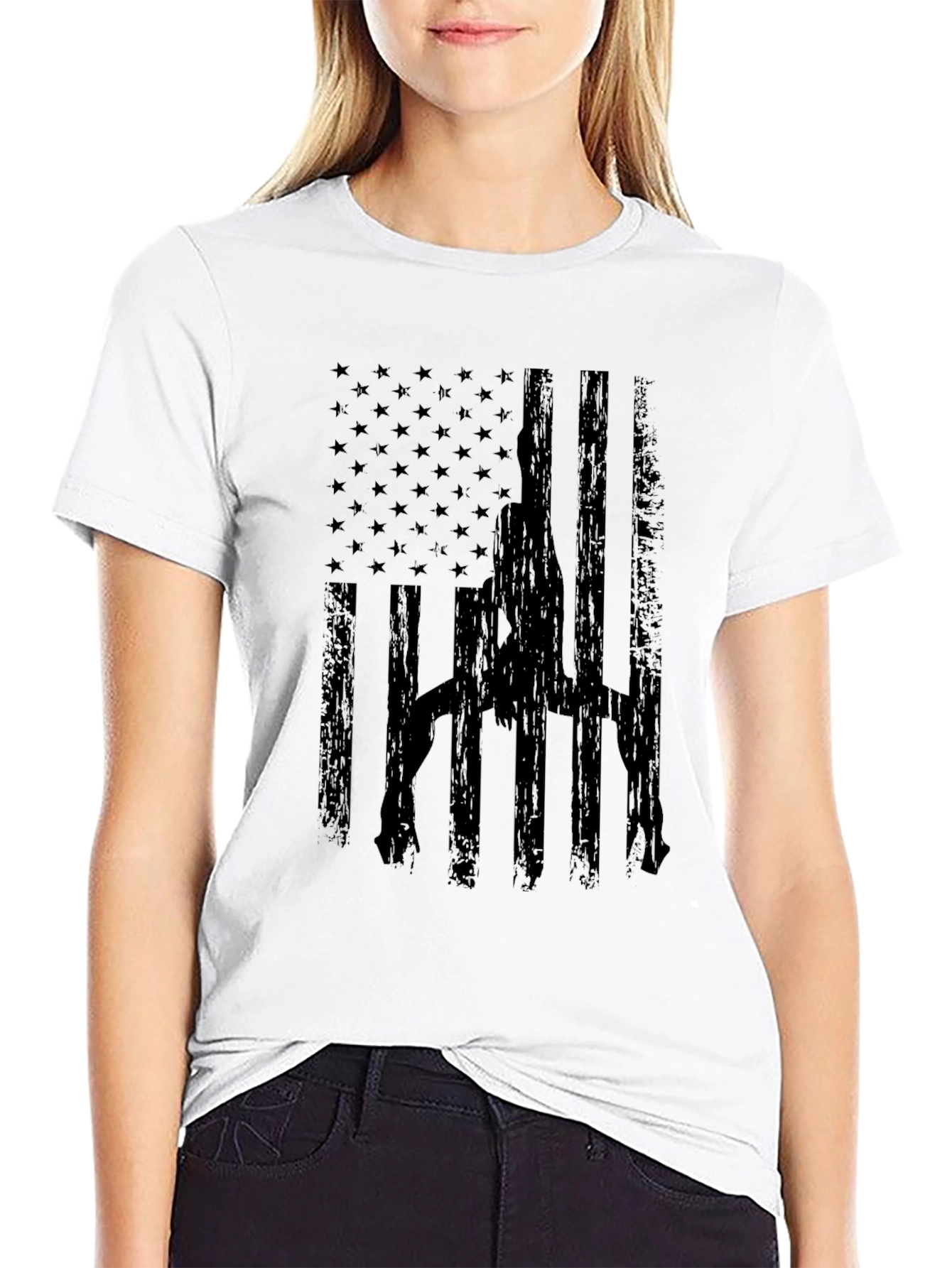 Show your unique style with this striking black t-shirt featuring a bold, distressed American flag design. A silhouette of a pole dancer stands out against the stars and stripes. This regular-fit tee is made from soft, breathable fabric, making it comfortable to wear all day long. It's perfect for casual outings, workouts, or making a statement. Pair it with jeans, shorts, or leggings for a stylish, edgy look. A great conversation starter, this shirt combines patriotism with a touch of unexpected flair.