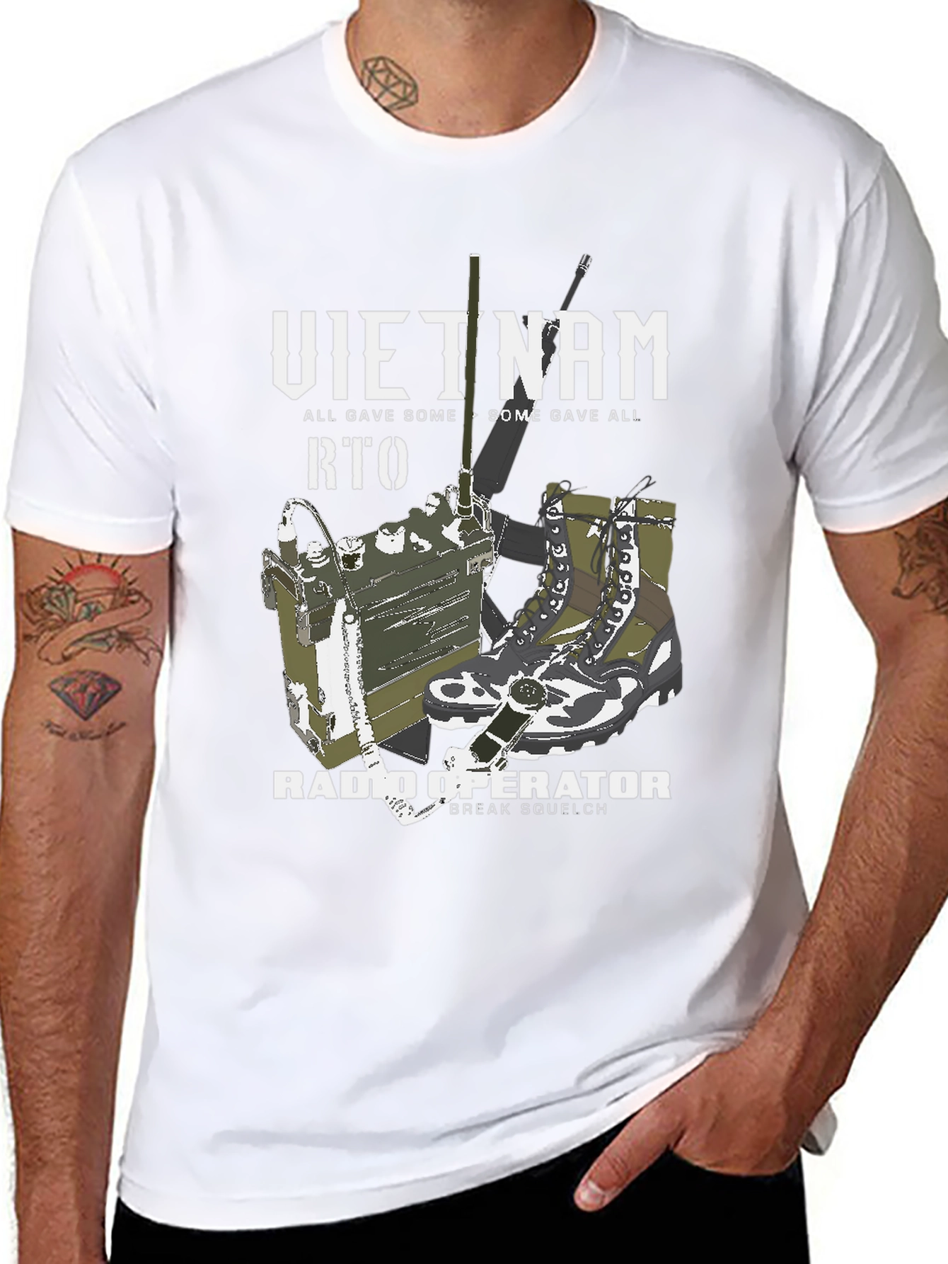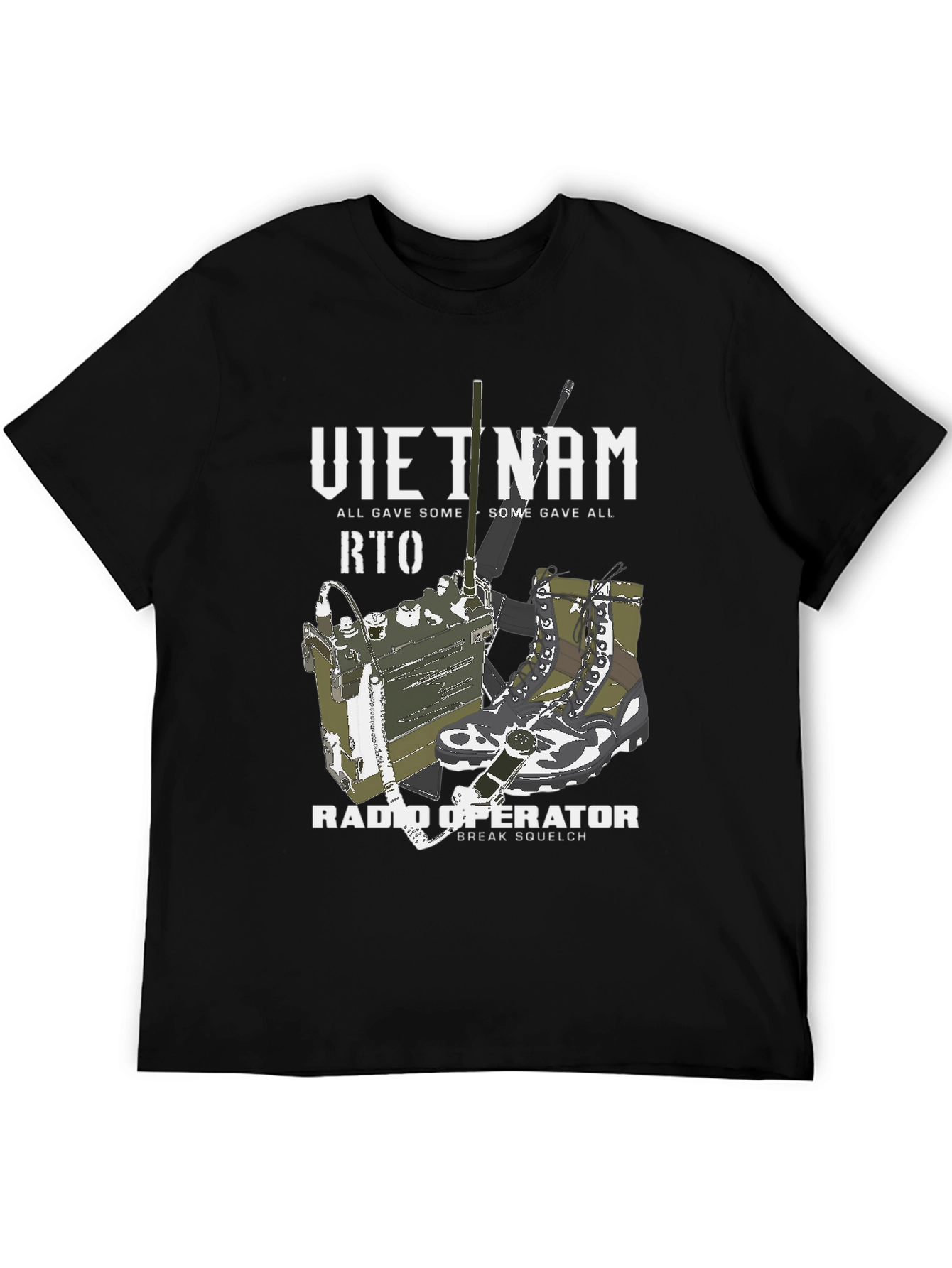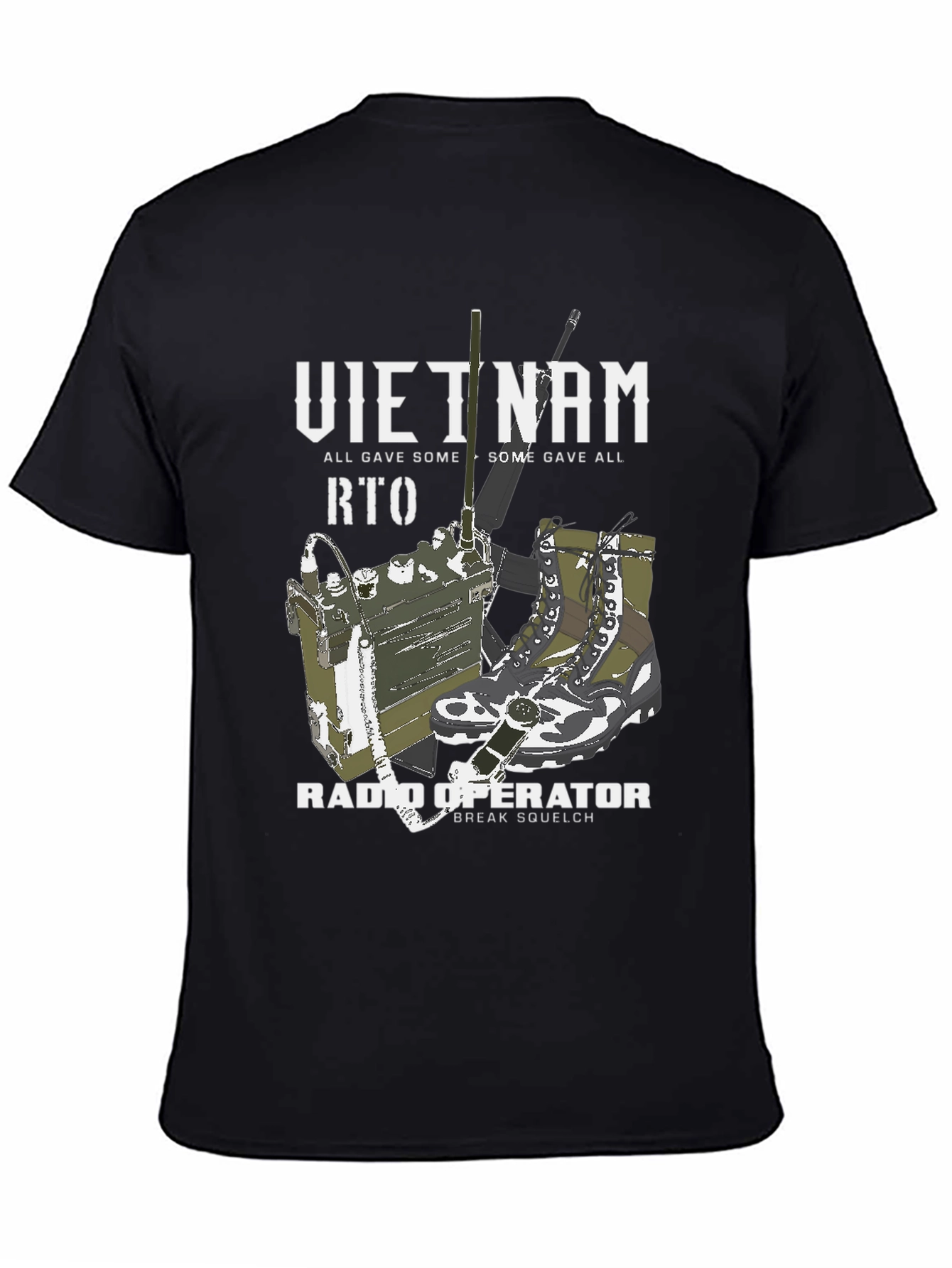 Show your support with this vintage-style graphic tee. The shirt features a detailed illustration of a Vietnam War-era RTO radio, combat boots, and a rifle. The text "VIETNAM", "RTO", and "RADIO OPERATOR" are prominently displayed in a bold, distressed font, completed with the phrase "ALL GAVE SOME, SOME GAVE ALL". Made from a comfortable fabric, this t-shirt is perfect for everyday wear, remembrance events, or as a unique gift for veterans and military history enthusiasts. Honor the service and sacrifice with this powerful and stylish tee.