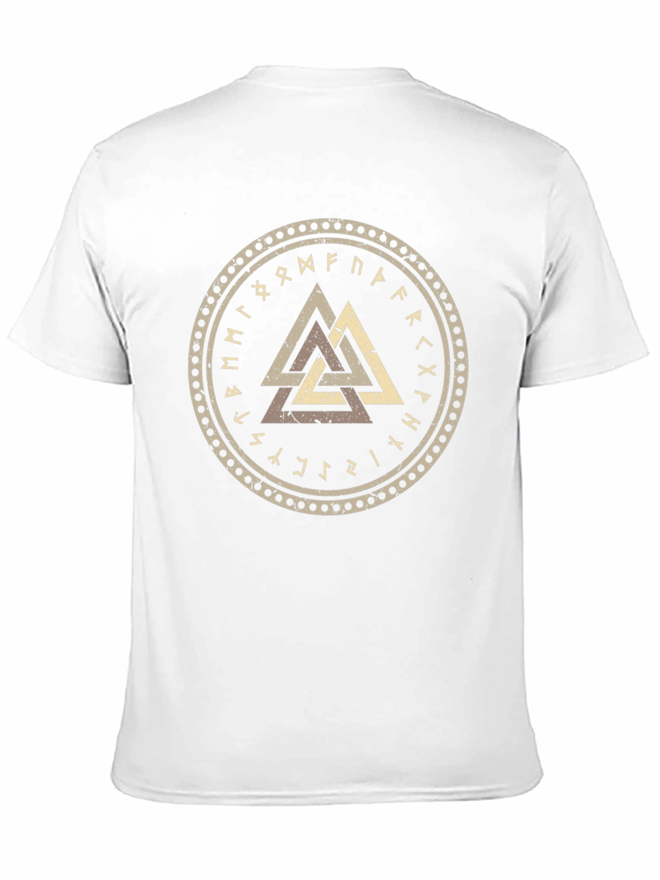 Show your Norse pride with this striking black t-shirt. The design features a Valhalla symbol, comprised of interlocking triangles, encircled by ancient runes. The faded, vintage-style print gives it a rugged, battle-worn look. Made from a comfortable material, this tee is perfect for everyday wear, Viking reenactments, or casual gatherings. Makes a great gift for anyone interested in Norse mythology and Viking history. Stand out from the crowd and embrace your inner warrior!