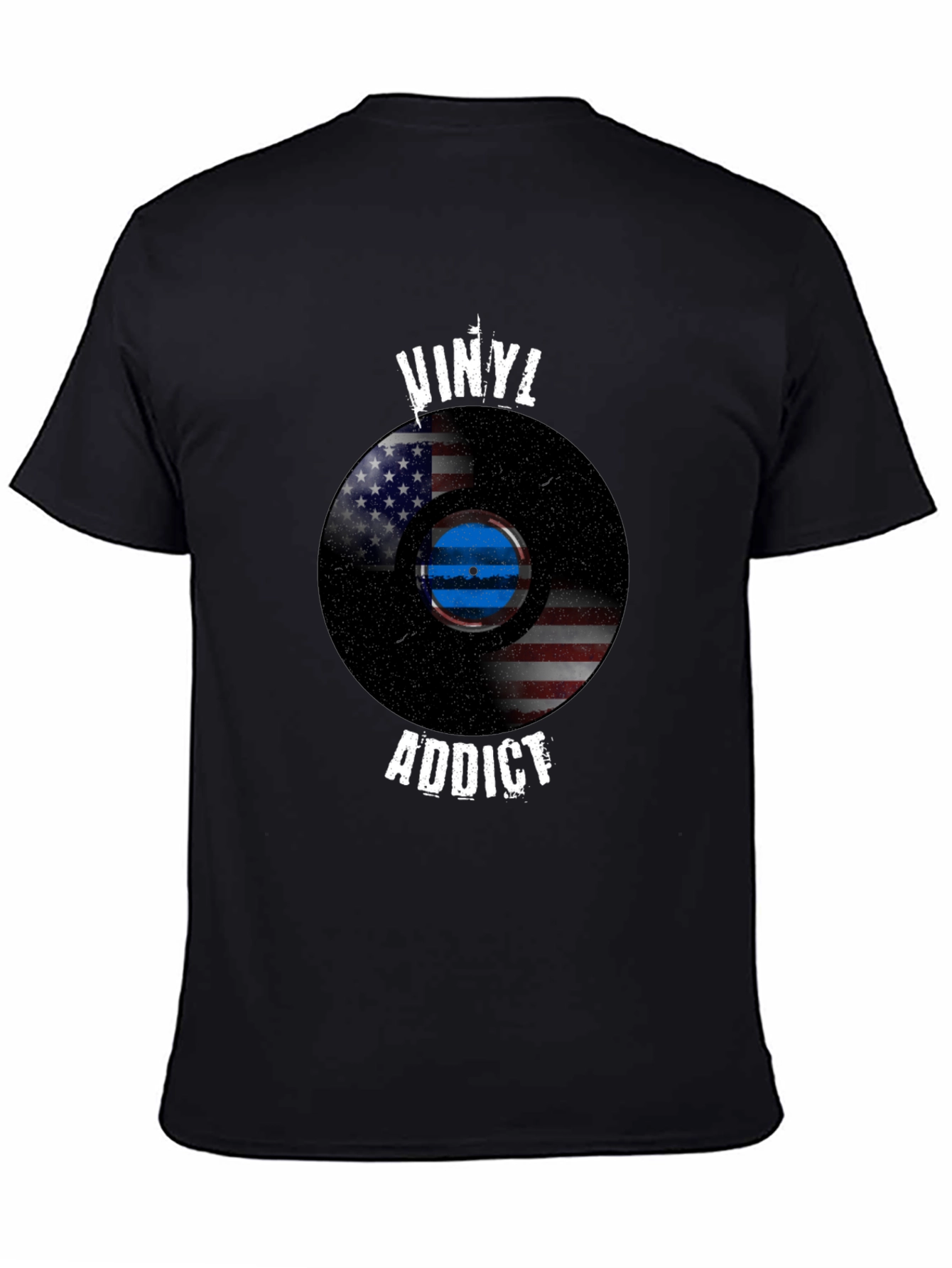 Show off your love for vinyl with this unique graphic tee! Featuring a bold design of a vinyl record overlaid with the American flag, this black t-shirt is perfect for music lovers and collectors. The words "Vinyl Addict" are printed above and below the record graphic in a distressed white font, adding a vintage touch. Made from comfortable, breathable fabric, this shirt is ideal for casual wear, concerts, or record store browsing. A great conversation starter, it's a must-have for any vinyl enthusiast's wardrobe. Get yours today and let everyone know about your passion for music!