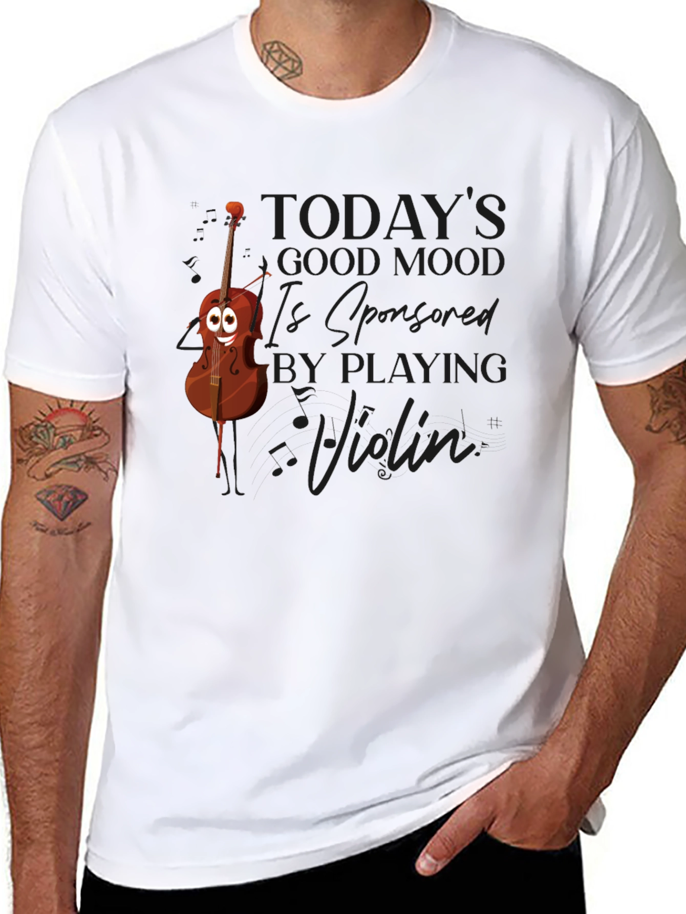 This unique men's t-shirt features a fun, cartoon-style violin graphic, making it a perfect pick for musicians and music lovers alike. The design includes the playful text, "Today's Good Mood Is Approved By Playing Violin." Made from a comfortable, black material, this tee is ideal for everyday wear, casual outings, or showing off your passion for music. It's a great conversation starter and a fun addition to any wardrobe. Perfect for violinists, orchestra members, or anyone who appreciates the beauty of a well-played tune.