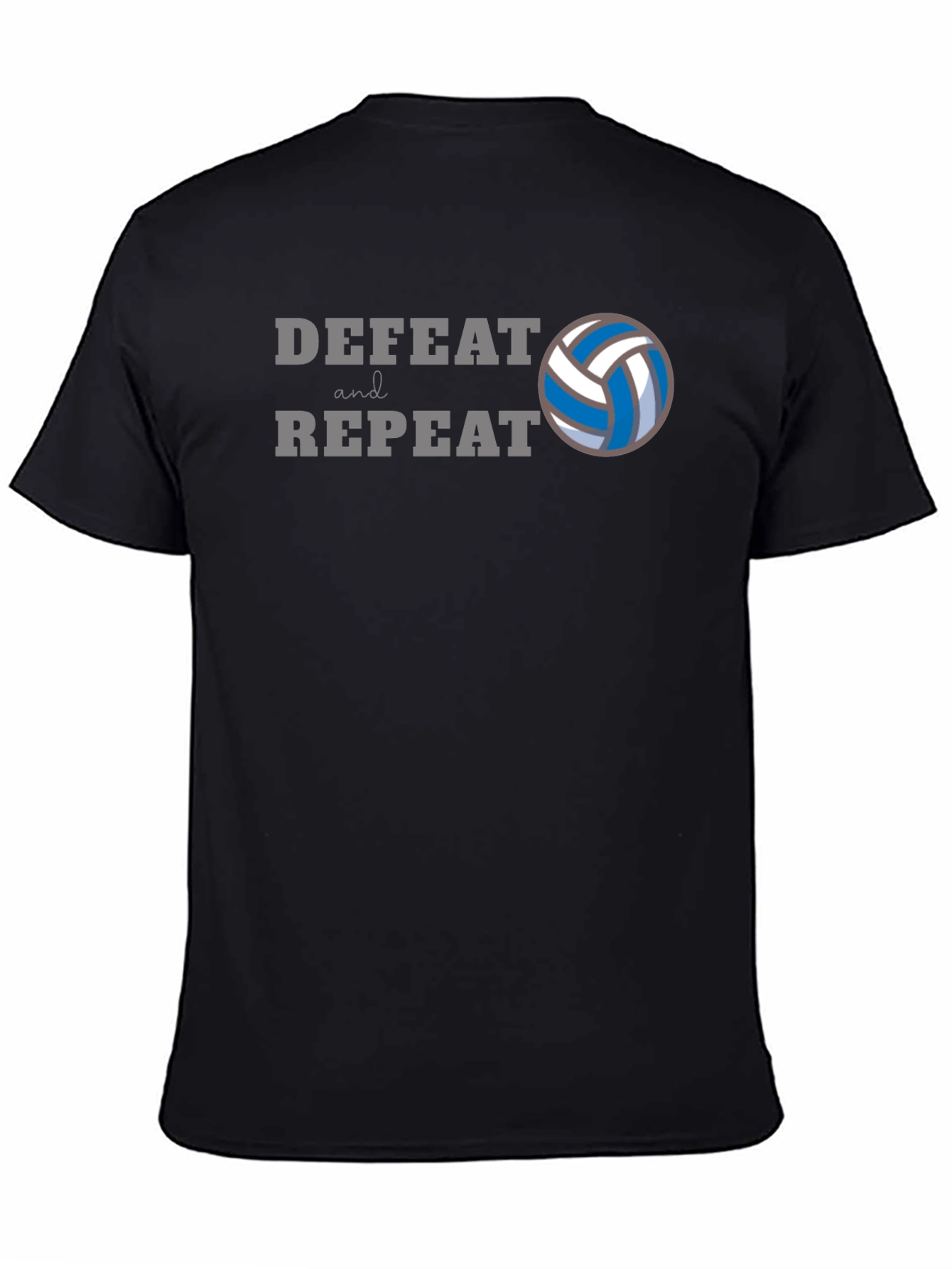 Dominate the court in this bold black t-shirt. This casual wear features the phrase "DEFEAT and REPEAT" accompanied by a blue and white volleyball graphic. The shirt's classic design makes it ideal for athletes and fans alike. Whether you're spiking, serving, or cheering from the sidelines, this tee is the perfect way to showcase your passion for volleyball. It's comfortable, stylish, and guaranteed to turn heads. A must-have addition to any volleyball enthusiast's wardrobe! This shirt is for both casual outings or intense game days.