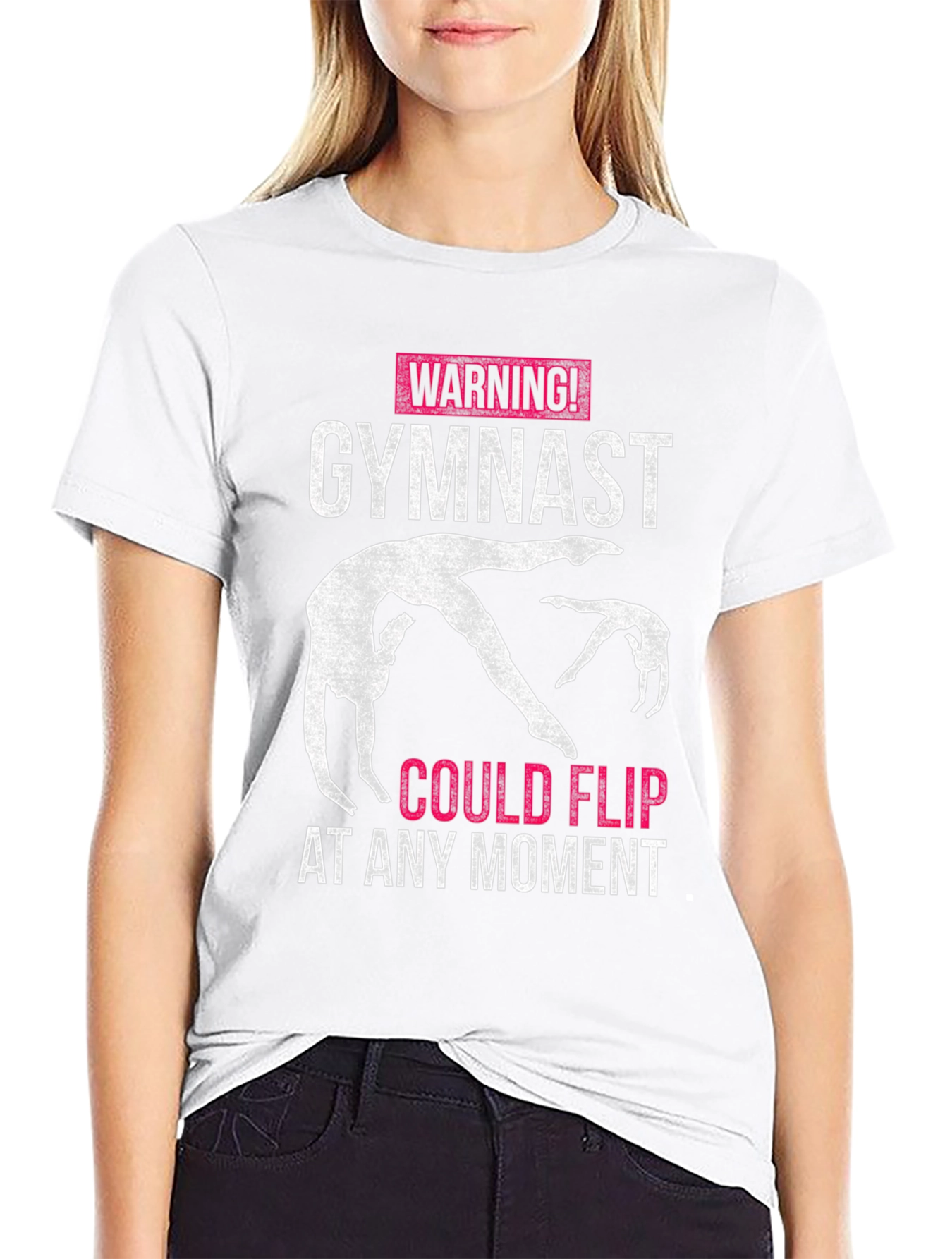 This black t-shirt features a humorous warning for anyone near a gymnast. The design includes the words "WARNING! GYMNAST COULD FLIP AT ANY MOMENT" in bold white font, with the word "WARNING!" accented in a pink banner. Below the text are stylized silhouettes of gymnasts performing flips, adding to the playful nature of the shirt. Made from a comfortable-looking fabric, this tee is perfect for gymnasts, coaches, or fans who want to show off their love for the sport with a touch of humor. Great for casual wear, gym workouts, or gymnastics meets.