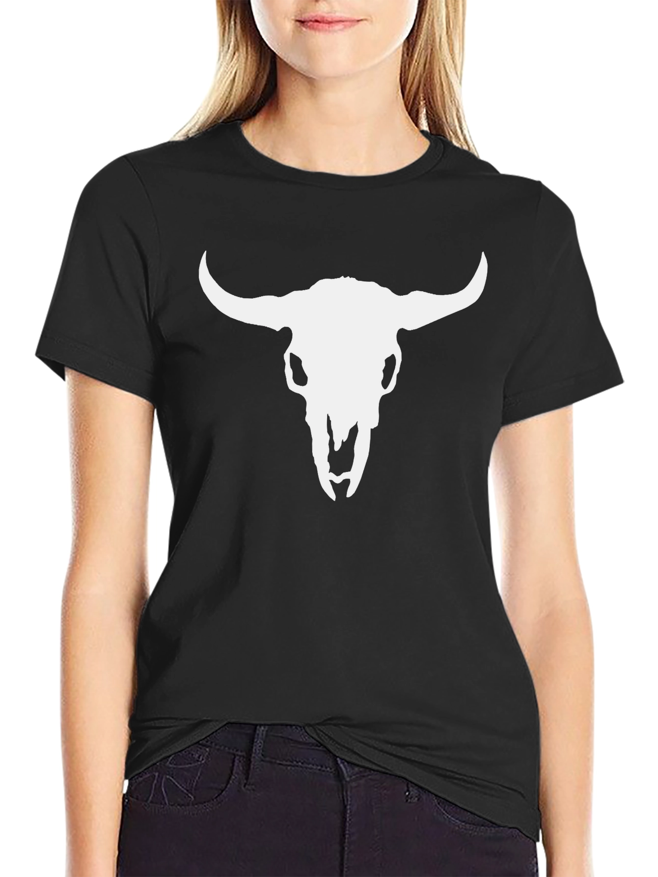 Show your Western style with this classic black t-shirt featuring a bold white bull skull graphic. Made from a comfortable material, this short-sleeve tee offers both style and comfort. The stark contrast of the white skull against the black background creates a striking visual impact, making it a great statement piece. Perfect for casual outings, concerts, or everyday wear, this shirt easily pairs with jeans, shorts, or even a jacket for a layered look. A must-have for anyone who loves Western fashion or wants to add an edgy touch to their wardrobe.