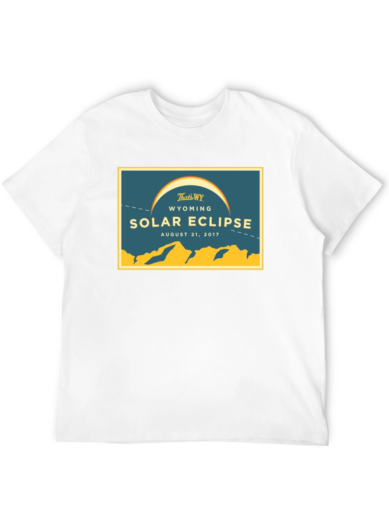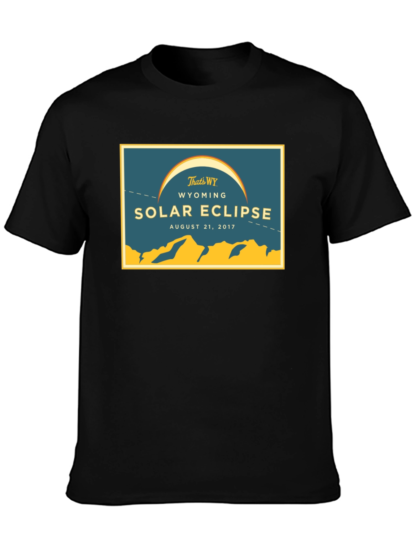 Capture the memory of a lifetime with this Wyoming Solar Eclipse commemorative t-shirt! This eye-catching black tee features a retro-inspired design in yellow and blue. The shirt showcases a beautiful depiction of the 2017 solar eclipse over the Wyoming landscape, complete with the tagline "That's WY" and the date "August 21, 2017". Made from what appears to be a soft and breathable cotton blend, this classic fit tee is perfect for casual wear, reliving the awe of the eclipse or as a unique souvenir from this special event. Comfortable and stylish, it's the perfect way to remember the Wyoming Solar Eclipse for years to come.