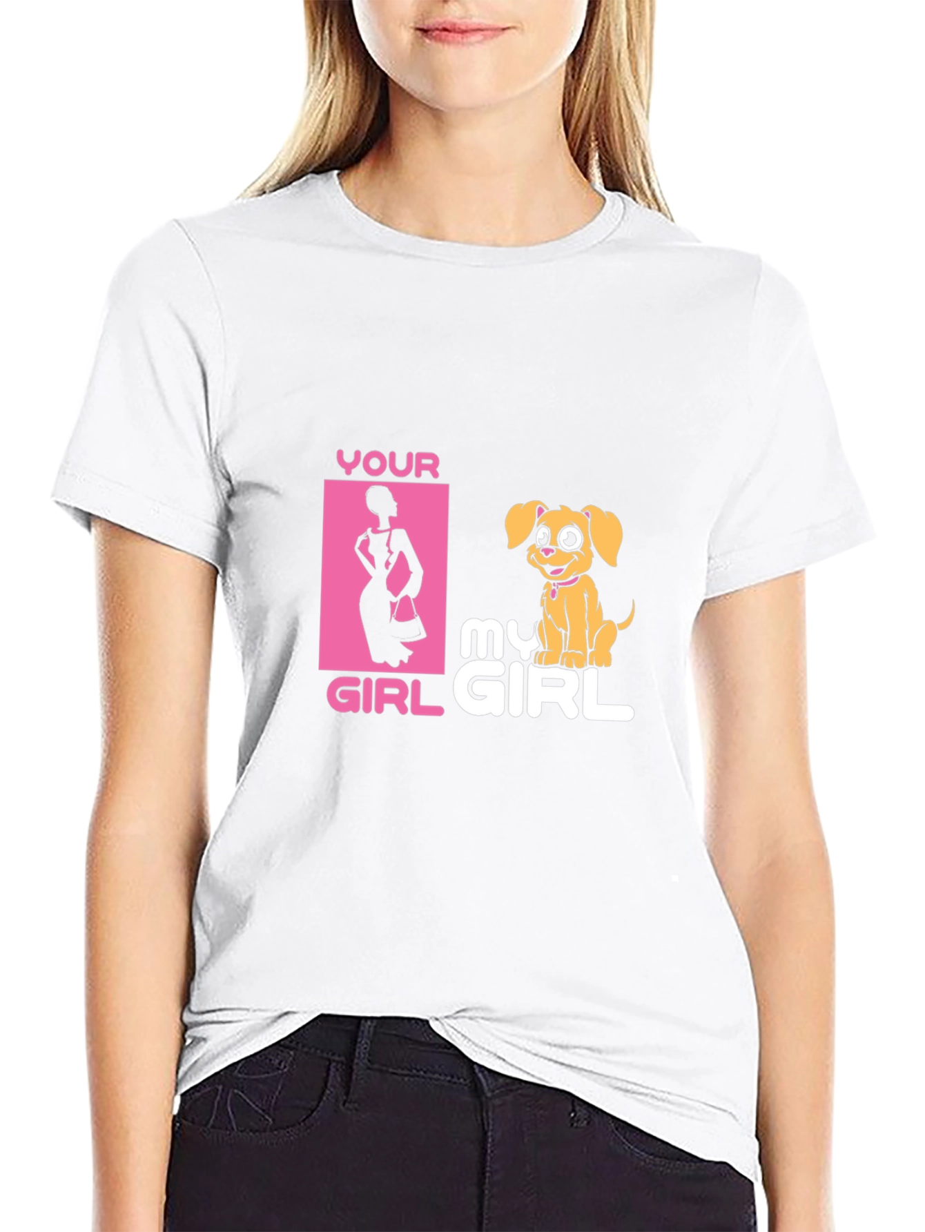 Show off your sense of humor with this unique graphic tee. The black t-shirt features a playful design comparing "your girl" (represented by a stylish silhouette) to "my girl" (a cute cartoon dog). The contrast between the pink and white graphics on the dark fabric creates a visually appealing look. Made from comfortable materials, this shirt is perfect for casual wear, dog park visits, or as a conversation starter. It's an ideal gift for pet lovers with a fun personality. Wear it and let everyone know who your true love is!