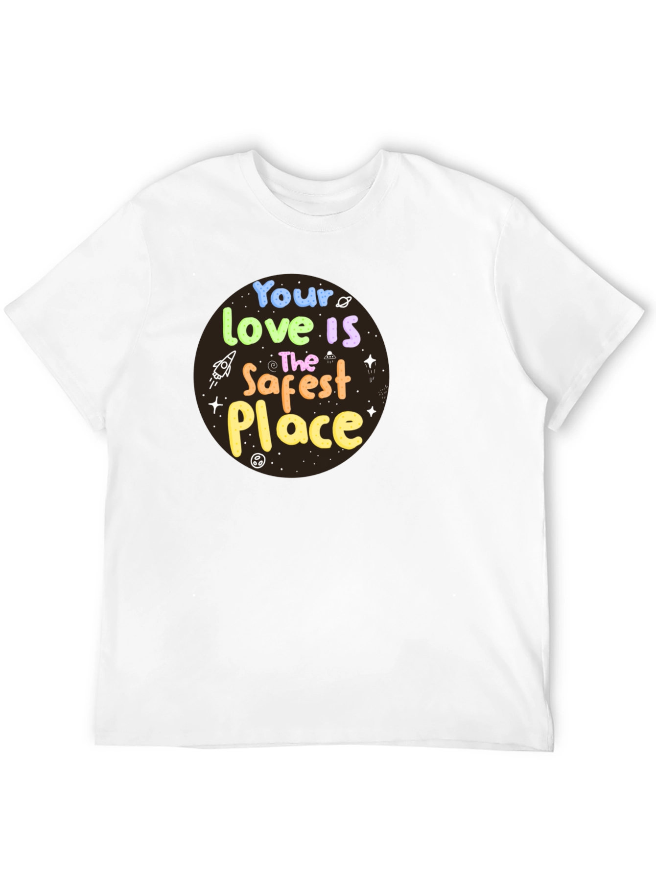 Embrace comfort and style with this eye-catching black t-shirt. The shirt features a vibrant, colorful graphic inside a circle that reads, "Your Love Is The Safest Place," adorned with space themed icons such as planets, stars, and rockets. Made from a soft, breathable fabric, this tee offers all-day comfort. Its classic fit makes it a versatile addition to any wardrobe, perfect for casual outings, relaxing at home, or expressing your unique personality. Show off your loving nature and make a statement with this trendy graphic tee!