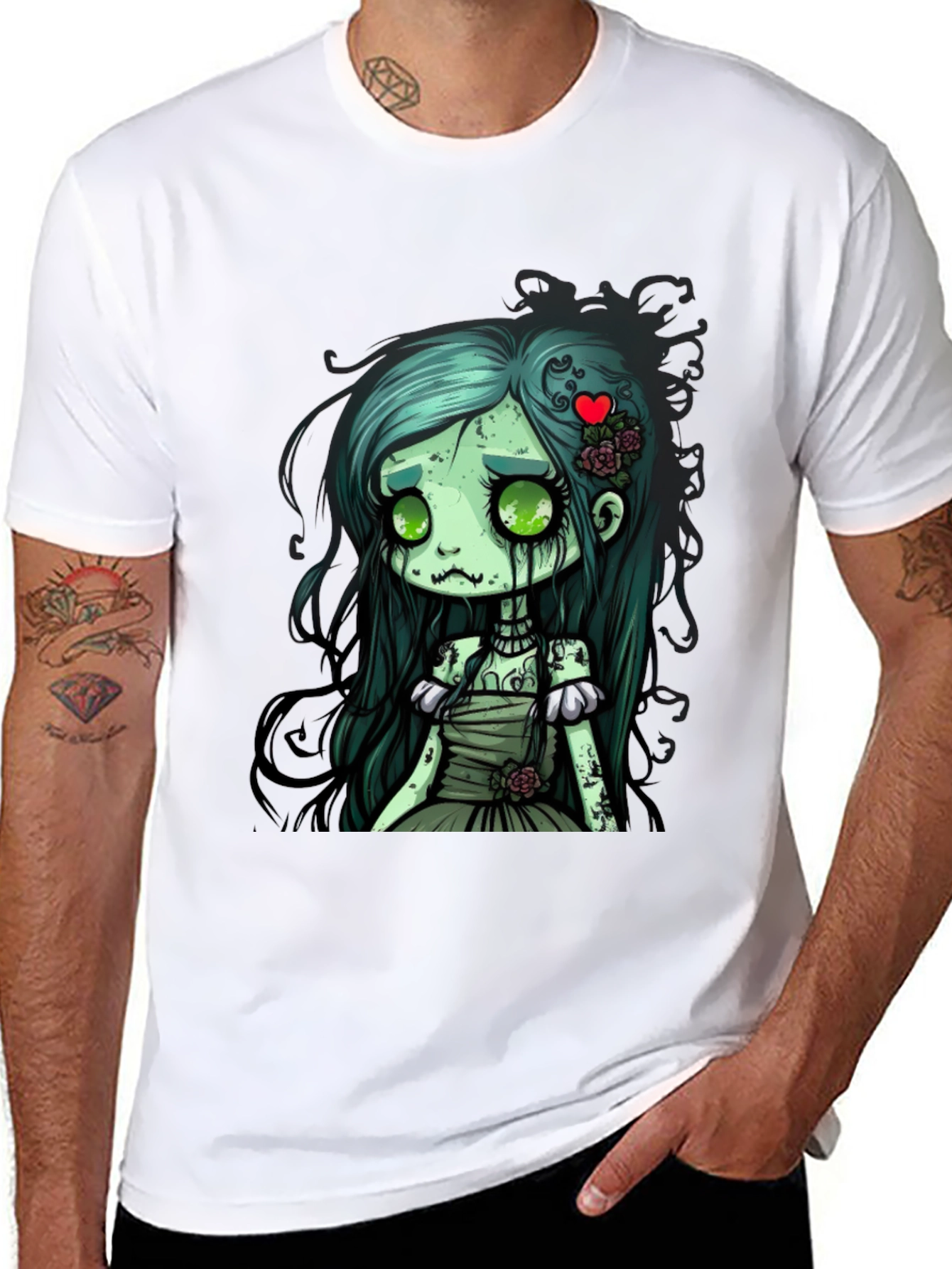 Embrace a unique blend of spooky and sweet with this eye-catching graphic tee. Featuring a captivating cartoon zombie girl design with vibrant green eyes and turquoise hair, this shirt is sure to turn heads. The intricate artwork includes rose accents and a subtle heart detail, adding a touch of gothic romance. Made from comfortable black fabric, this t-shirt is perfect for casual wear, Halloween events, or expressing your individual style. Show off your love for all things cute and creepy with this must-have wardrobe addition. Great for those who love alternative fashion!