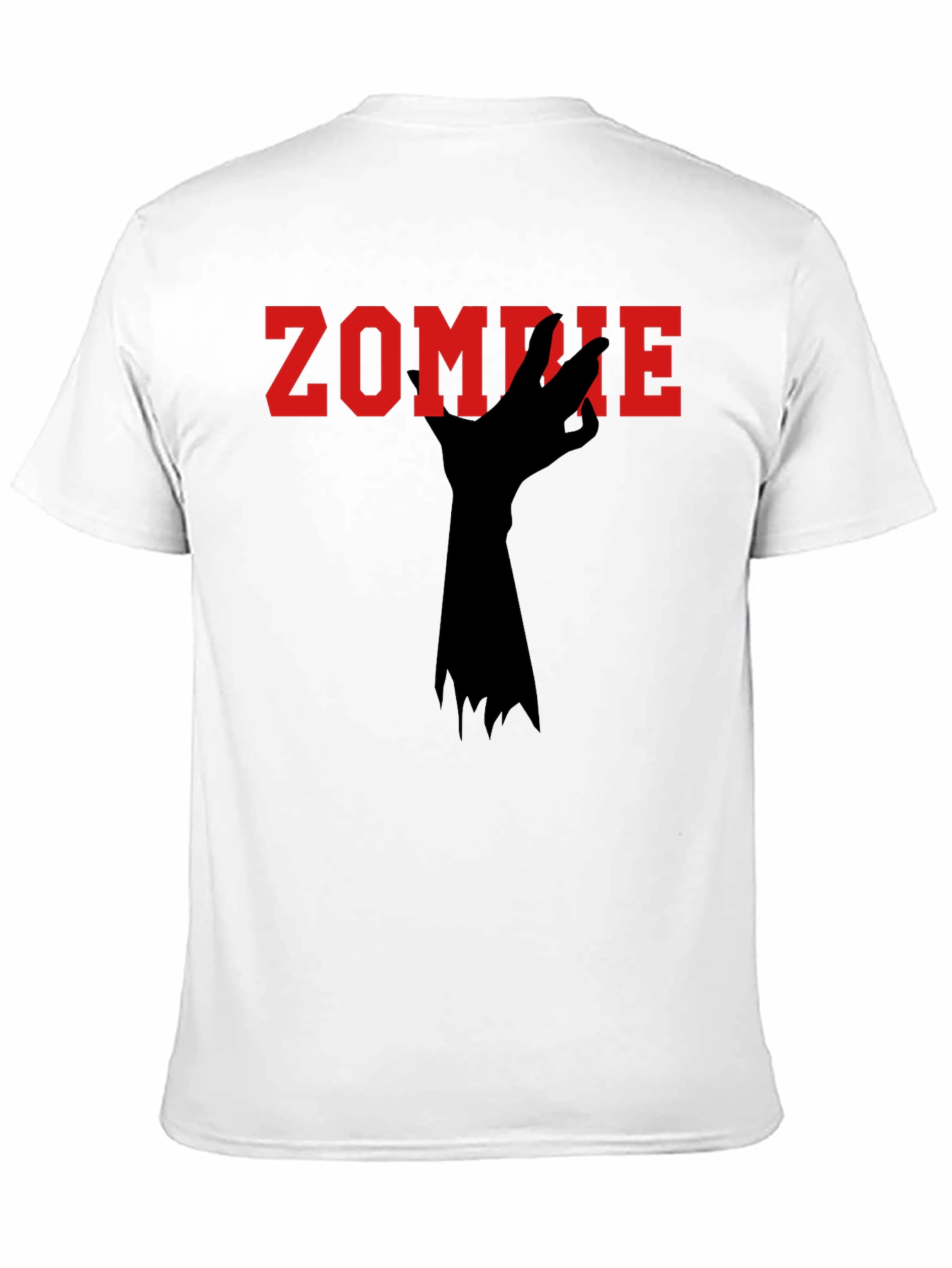 Embrace the spirit of Halloween with this eye-catching black t-shirt. Featuring a bold "ZOMBIE" text graphic in striking red above a sinister reaching hand silhouette, this tee is perfect for spooky season. The design makes a statement, while the classic fit ensures comfortable wear. Made from what appears to be a soft, breathable cotton blend, this t-shirt is ideal for casual outings, costume parties, or expressing your love for all things undead. Make a statement and turn heads with this unique zombie-themed tee. Pair it with jeans or shorts for a relaxed, stylish look. Get yours today and unleash your inner zombie!